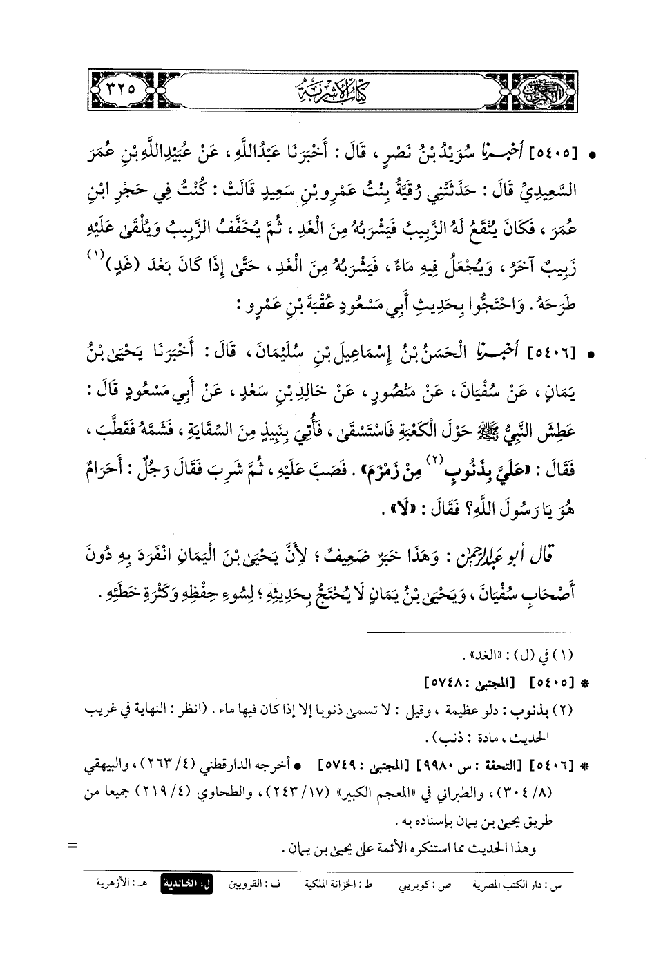 قَالَ أَبو عَبدِ الرَّحمَنِ: وَهَذَا خَبَرٌ ضَعِيفٌ؛ لأَنَّ يَحْيَى بْنَ اليَمَانِ انْفَرَدَ بِهِ دُونَ أَصْحَابِ سُفيانَ، وَيَحْيَى بنُ يَمَانٍ لا يُحْتَجُّ بِحَدِيثِهِ لِسُوءِ حِفْظِهِ وَكَثْرَةِ خَطَئِهِ.