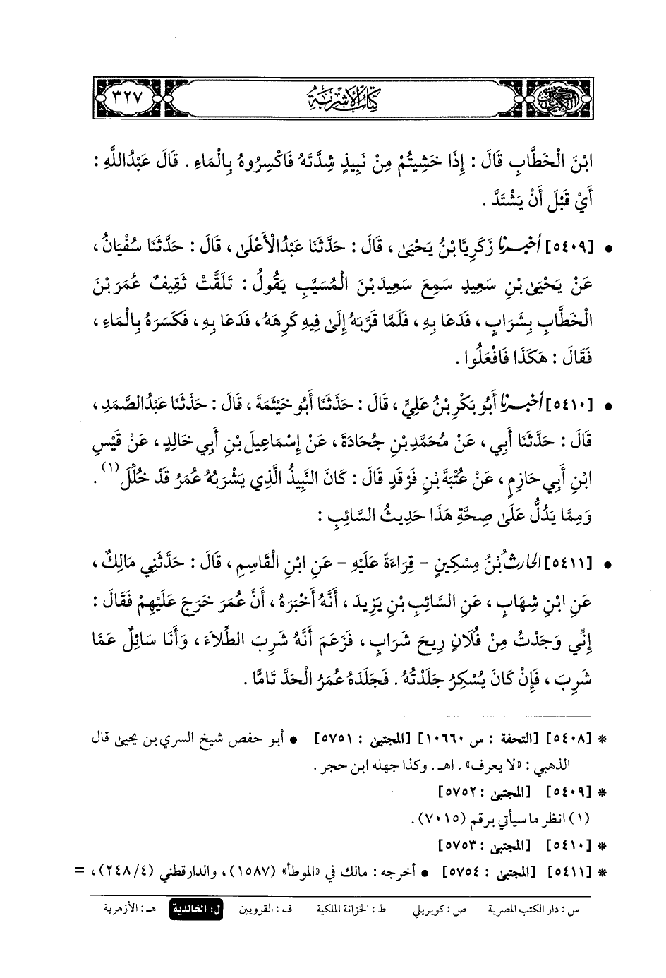 5411- الحَارِثُ بنُ مِسْكِينٍ، قِرَاءَةً عَلَيْهِ، عَنِ ابْنِ القَاسِمِ، قَالَ: حَدَّثني مَالِكٌ، عَنِ ابْنِ شِهَابٍ، عَنِ السَّائِبِ بنِ يَزِيدَ، أَنَّهُ أَخْبَرَهُ؛ أَنَّ عُمَرَ خَرَجَ عَلَيْهِمْ، فَقَالَ: إِنِّي وَجَدْتُ مِنْ فُلانٍ رِيحَ شَرَابٍ، فَزَعَمَ أَنَّهُ شَرِبَ الطِّلاءِ، وَأَنَا سَائِلٌ عَمَّا شَرِبَ، فَإِنْ كَانَ يُسْكِرُ جَلَدْتُهُ، فَجَلَدَهُ عُمَرُ الحَدَّ تَامًّا.
