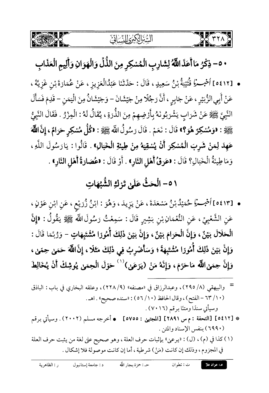 5413- أَخبَرنا حُمَيْدُ بنُ مَسْعَدَةَ، عَن يَزِيدَ، وَهُوَ ابْنُ زُرَيْعٍ، عَنِ ابْنِ عَوْنٍ، عَنِ الشَّعْبِيِّ، عَنِ النُّعْمَانِ بنِ بَشِيرٍ، قَالَ: سَمِعْتُ رَسُولَ اللهِ صَلى الله عَلَيهِ وسَلم يَقُولُ: إِنَّ الحَلالَ بَيِّنٌ، وَإِنَّ الحَرَامَ بَيِّنٌ، وَإِنَّ بَيْنَ ذَلِكَ أُمُورًا مُشْتَبِهَاتٍ، وَرُبَّمَا قَالَ: وَإِنَّ بَيْنَ ذَلِكَ أُمُورًا مُشْتَبِهَةً، وَسَأَضْرِبُ فِي ذَلِكَ مَثَلاً، إِنَّ اللهَ حِمَى حِمًى، وَإِنَّ حِمَى اللهِ مَا حَرَّمَ، وَإِنَّهُ مَنْ يَرْعَى حَوْلَ الحِمَى يُوشِكُ أَنْ يُخَالِطَ الحِمَى، وَرُبَّمَا قَالَ: يُوشِكُ أَنْ يَرْتَعَ، وَإِنَّهُ مَنْ يُخَالِطِ الرِّيبَةَ يُوشِكُ أَنْ يَجْسُرَ.