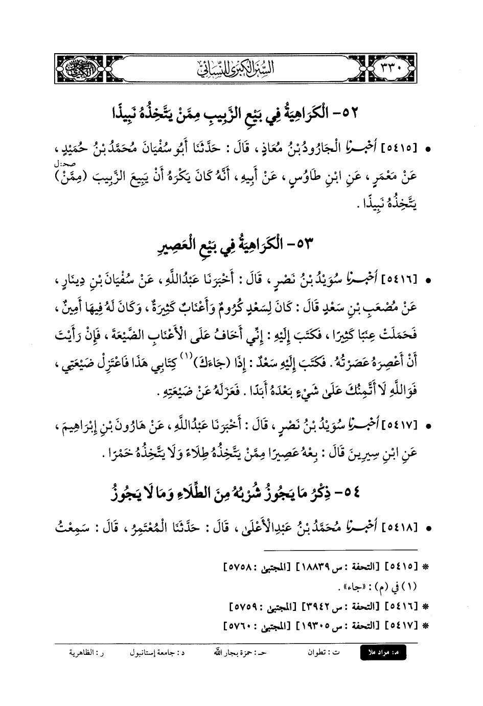 5415- أَخبَرنا الجَارُودُ بنُ مُعَاذٍ، قَالَ: حَدَّثنا أَبو سُفيانَ مُحَمدُ بنُ حُمَيْدٍ، عَن مَعْمَرٍ، عَنِ ابْنِ طَاوُوسٍ، عَن أَبيهِ، أَنَّهُ كَانَ يَكْرَهُ أَنْ يَبِيعَ الزَّبِيبَ مِمَّنْ يَتَّخِذُهُ نَبِيذًا.