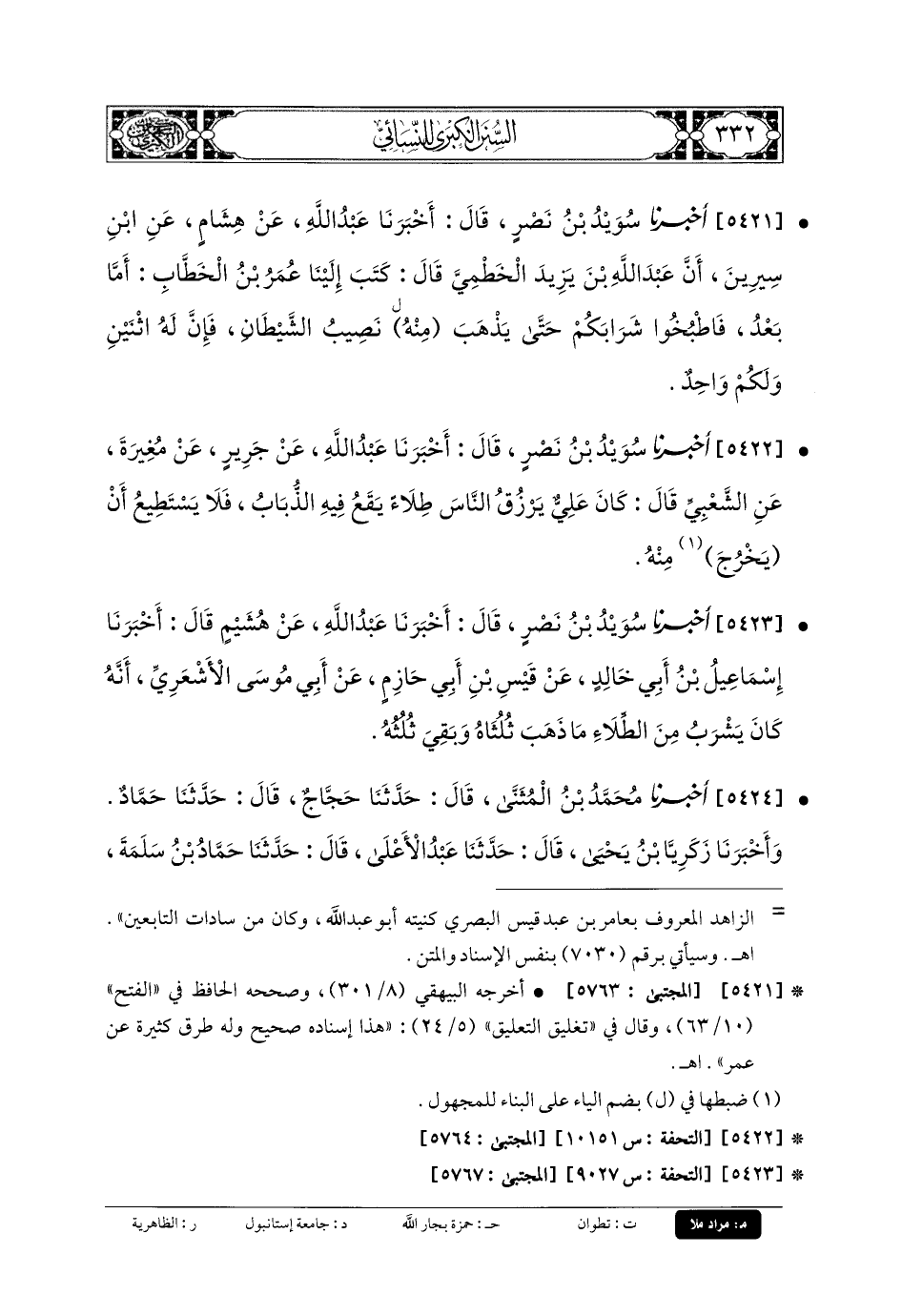 5421- أَخبَرنا سُوَيْدُ بنُ نَصْرٍ، قَالَ: أَخبَرنا عَبدُ اللهِ، عَن هِشَامٍ، عَنِ ابْنِ سِيرِينَ، أَنَّ عَبدَ اللهِ بْنَ يَزِيدَ الخَطْمِيَّ، قَالَ: كَتَبَ إِلَيْنَا عُمَرُ بنُ الخَطَّابِ: أَمَّا بَعْدُ فَاطْبُخُوا شَرَابَكُمْ حَتَّى يَذْهَبَ مِنْهُ نَصِيبُ الشَّيْطَانِ؛ فَإِنَّ لَهُ اثْنَيْنِ وَلَكُمْ وَاحِدٌ.
