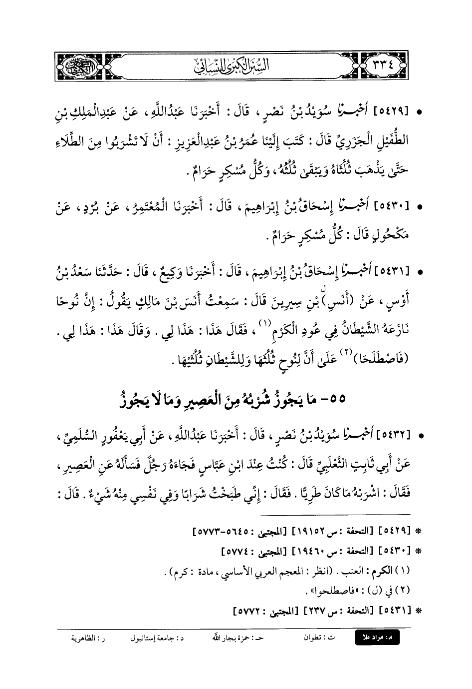 5432- أَخبَرنا سُوَيْدُ بنُ نَصْرٍ، قَالَ: أَخبَرنا عَبدُ اللهِ، عَن أَبي يَعْفُورٍ السُّلَمِيِّ، عَن أَبي ثَابِتٍ الثَّعْلَبِيِّ، قَالَ: كُنْتُ عِنْدَ ابْنِ عَبَّاسٍ، فَجَاءَهُ رَجُلٌ فَسَأَلَهُ عَنِ العَصِيرِ، فَقَالَ: اشْرَبُوا مَا كَانَ طَرِيًّا، فَقَالَ: إِنِّي طَبَخْتُ شَرَابًا وَفِي نَفْسِي مِنْهُ شَيْءٌ، قَالَ: أَكُنْتَ شَارِبَهُ قَبْلَ أَنْ تَطْبُخَهُ؟ قَالَ: لا، قَالَ: فَإِنَّ النَّارَ لا تُحِلُّ شَيْئًا قَدْ حُرِّمَ.