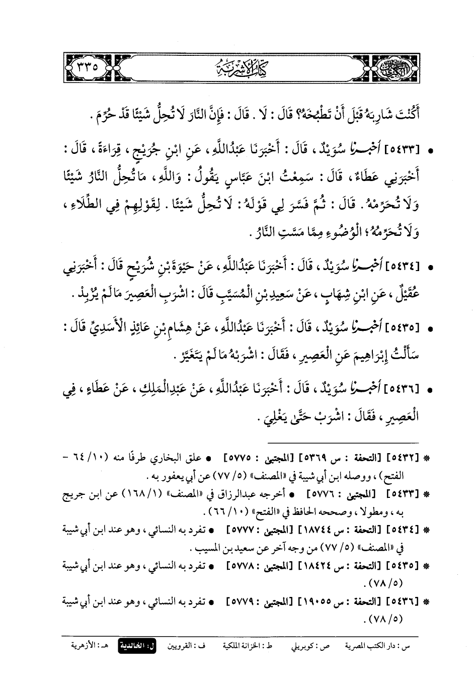 5433- أَخبَرنا سُوَيْدٌ، قَالَ: أَخبَرنا عَبدُ اللهِ، عَنِ ابْنِ جُرَيْجٍ، قِرَاءَةً، قَالَ: أَخْبَرَنِي عَطَاءٌ، قَالَ: سَمِعْتُ ابْنَ عَبَّاسٍ يَقُولُ: وَاللهِ مَا تُحِلُّ النَّارُ شَيْئًا وَلا تُحَرِّمْهُ، قَالَ: ثُمَّ فَسَّرَ لِي قَوْلَهُ: لا تُحِلُّ شَيْئًا لِقَوْلِهِمْ فِي الطِّلاءِ، وَلا تُحَرِّمُهُ الوُضُوءُ مِمَّا مَسَّتِ النَّار.