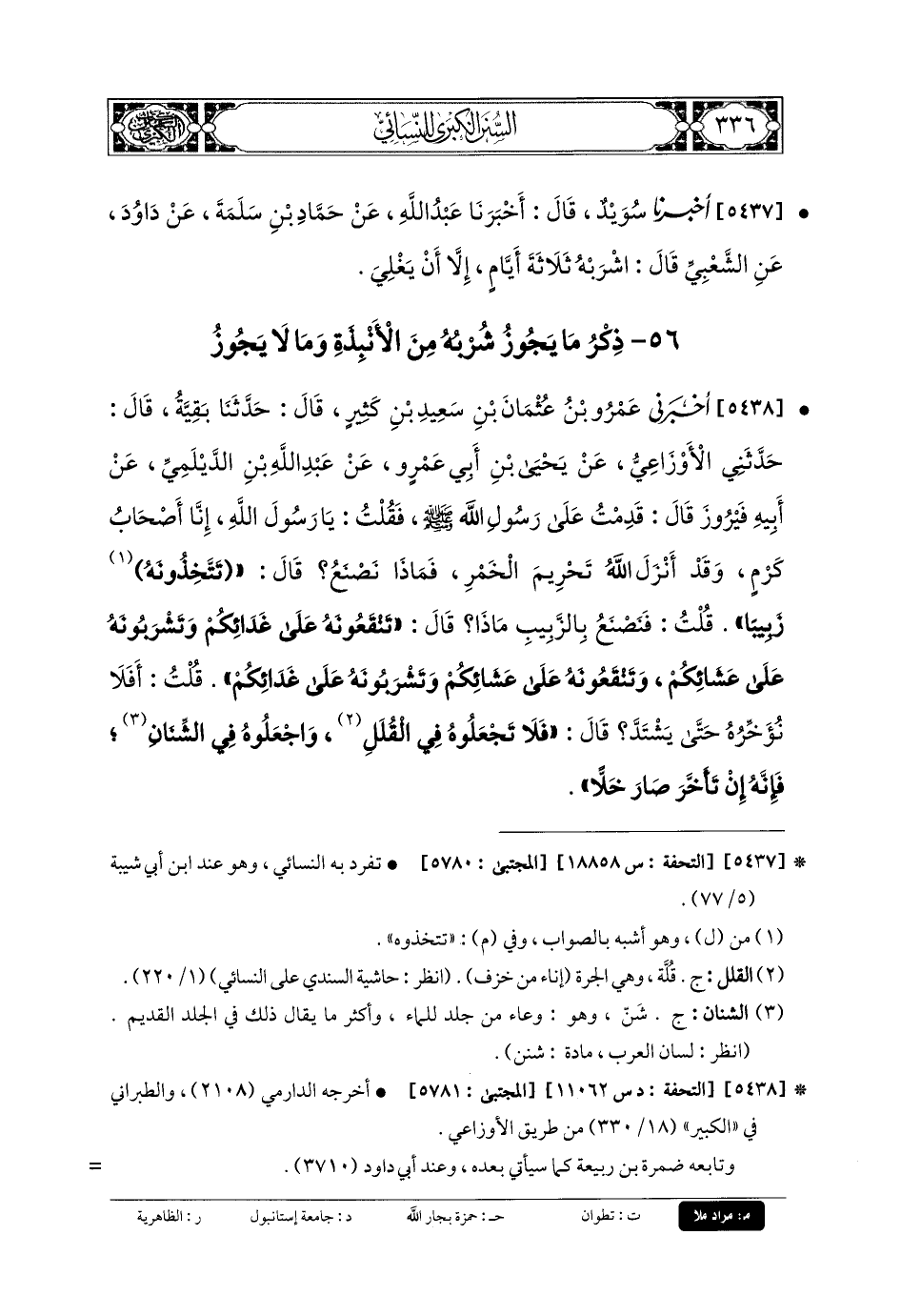 5438- أَخْبَرَنِي عَمْرُو بنُ عُثْمَانَ بنِ سَعِيدِ بنِ كَثِيرٍ، قَالَ: حَدَّثنا بَقِيَّةُ، قَالَ: حَدَّثني الأَوْزَاعِيُّ، عَن يَحْيَى بنِ أَبي عَمْرٍو، عَن عَبدِ اللهِ بنِ الدَّيْلَمِيِّ، عَن أَبيهِ فَيْرُوزَ قَالَ: قَدِمْتُ عَلَى رَسُولِ اللهِ صَلى الله عَلَيهِ وسَلم فَقُلْتُ: يَا رَسُولَ اللهِ، إِنَّا أَصْحَابُ كَرْمٍ، وَقَدْ أَنْزَلَ اللهُ تَحْرِيمَ الخَمْرِ، فَمَاذَا نَصْنَعُ؟ قَالَ: تَتَّخِذُونَهُ زَبِيبًا، قُلْتُ: فَنَصْنَعُ بِالزَّبِيبِ مَاذَا؟ قَالَ: تَنْقَعُونَهُ عَلَى غَدَائِكُمْ وَتَشْرَبُونَهُ عَلَى عَشَائِكُمْ، وَتَنْقَعُونَهُ عَلَى عَشَائِكُمْ وَتَشْرَبُونَهُ عَلَى غَدَائِكُمْ، قُلْتُ: أَفَلا نُؤَخِّرُهُ حَتَّى يَشْتَدَّ؟ قَالَ: فَلا تَجْعَلُوهُ فِي القُلَلِ، وَاجْعَلُوهُ فِي الشِّنَانِ، فَإِنَّهُ إِنْ تَأَخَّرَ صَارَ خَلاًّ.