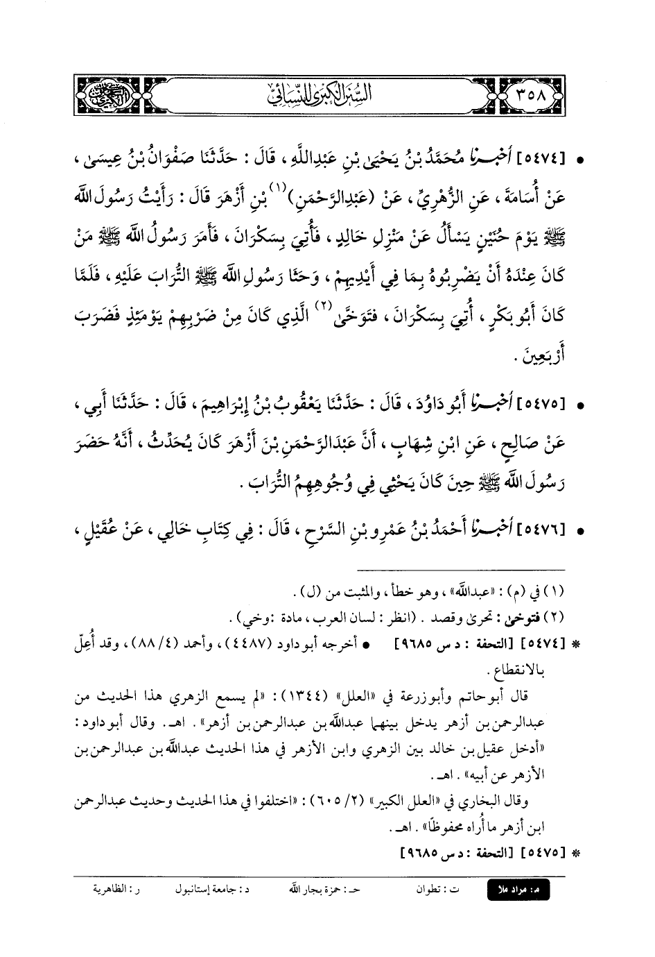5474- أَخبَرنا مُحَمدُ بنُ يَحْيَى بنِ عَبدِ اللهِ، قَالَ: حَدَّثنا صَفْوَانُ بنُ عِيسَى، عَن أُسَامَةَ، عَنِ الزُّهْرِيِّ، عَن عَبدِ الرَّحمَنِ بنِ أَزْهَرَ، قَالَ: رَأَيْتُ رَسُولَ اللهِ صَلى الله عَلَيهِ وسَلم يَوْمَ حُنَيْنٍ يَسْأَلُ عَن مَنْزِلِ خَالِدٍ، فَأُتِيَ بِسَكْرَانَ، فَأَمَرَ رَسُولُ اللهِ صَلى الله عَلَيهِ وسَلم مَنْ كَانَ عِنْدَهُ أَنْ يَضْرِبُوهُ بِمَا فِي أَيْدِيهِمْ، وَحَثَا رَسُولُ اللهِ صَلى الله عَلَيهِ وسَلم التُّرَابَ عَلَيْهِ، فَلَمَّا كَانَ أَبو بَكْرٍ أُتِيَ بِسَكْرَانَ، فَتَوَخَّى الَّذِي كَانَ مِنْ ضَرْبِهِمْ يَوْمَئِذٍ، فَضَرَبَ أَرْبَعِينَ.