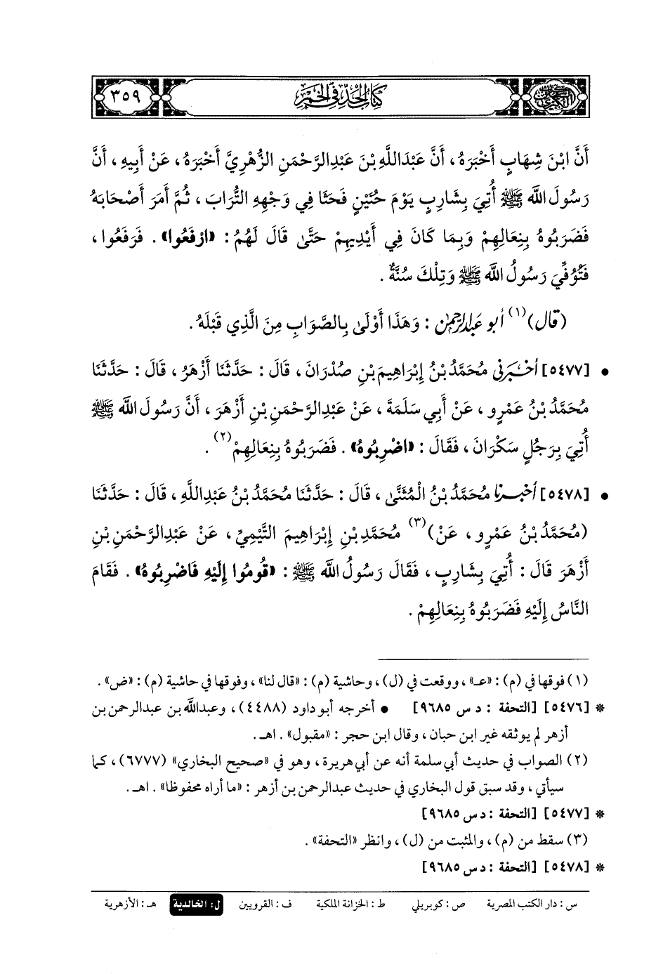 5478- أَخبَرنا مُحَمدُ بنُ المُثَنَّى، قَالَ: حَدَّثنا مُحَمدُ بنُ عَبدِ اللهِ، قَالَ حَدَّثنا مُحَمدُ بنُ عَمْرٍو، عَن مُحَمدِ بنِ إِبْرَاهِيمَ التَّيْمِيِّ، عَن عَبدِ الرَّحمَنِ بنِ أَزْهَرَ، قَالَ: أُتِيَ بِشَارِبٍ، فَقَالَ رَسُولُ اللهِ صَلى الله عَلَيهِ وسَلم: قُومُوا إِلَيْهِ فَاضْرِبُوهُ، فَقَامَ النَّاسُ إِلَيْهِ فَضَرَبُوهُ بِنِعَالِهِمْ.