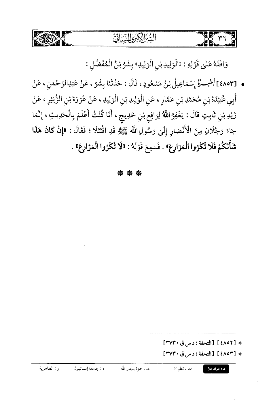 4853 - أَخبَرنا إِسمَاعِيلُ بنُ مَسْعُودٍ، قَالَ: حَدَّثنا بِشْرٌ، عَن عَبدِ الرَّحمَنِ، عَن أَبي عُبَيْدَةَ بنِ مُحَمدِ بنِ عَمَّارٍ، عَنِ الوَلِيدِ بنِ الوَلِيدِ، عَن عُرْوَةَ بنِ الزُّبَيْرِ، عَن زَيْدِ بنِ ثَابِتٍ قَالَ: يَغْفِرُ اللهُ لِرَافِعِ بنِ خَدِيجٍ، أَنَا كُنْتُ أَعْلَمُ بِالحَدِيثِ، إِنَّمَا جَاءَ رَجُلانِ مِنَ الأَنْصَارِ إِلَى رَسُولِ اللهِ صَلى الله عَلَيهِ وسَلم قَدِ اقْتَتَلا، فَقَالَ: إِنْ كَانَ هَذَا شَأْنَكُمْ فَلا تُكْرُوا المَزَارِعَ، فَسَمِعَ قَوْلَهُ: لا تُكْرُوا المَزَارِعَ.