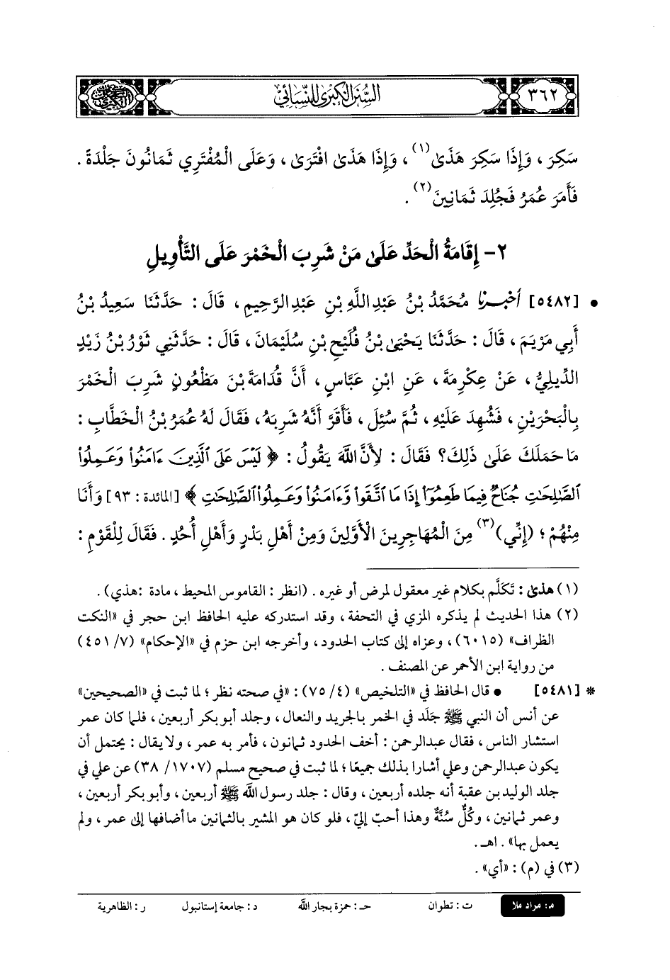 5482- أَخبَرنا مُحَمدُ بنُ عَبدِ اللهِ بنِ عَبدِ الرَّحِيمِ، قَالَ حَدَّثنا سَعِيدُ بنُ أَبي مَرْيَمَ، قَالَ: حَدَّثنا يَحْيَى بنُ فُلَيْحِ بنُ سُلَيْمَانَ، قَالَ: حَدَّثني ثَوْرُ بنُ زَيْدٍ الدِّيلِيُّ، عَن عِكْرِمَةَ، عَنِ ابْنِ عَبَّاسٍ، أَنَّ قُدَامَةَ بْنَ مَظْعُونٍ شَرِبَ الخَمْرَ بِالبَحْرَيْنِ، فَشُهِدَ عَلَيْهِ، ثُمَّ سُئِلَ فَأَقَرَّ أَنَّهُ شَرِبَهُ، فَقَالَ لَهُ عُمَرُ بنُ الخَطَّابِ: مَا حَمَلَكَ عَلَى ذَلِكَ، فَقَالَ: لأَنَّ اللهَ يَقُولُ: {لَيْسَ عَلَى الَّذِينَ آمَنُوا وَعَمِلُوا الصَّالِحَاتِ جُنَاحٌ فِيمَا طَعِمُوا إِذَا مَا اتَّقَوْا وَآمَنُوا وَعَمِلُوا الصَّالِحَاتِ}، وَأَنَا مِنْهُمْ أَيْ مِنَ المُهَاجِرِينِ الأَوَّلِينَ، وَمِنْ أَهْلِ بَدْرٍ، وَأَهْلِ أُحُدٍ، فَقَالَ لِلْقَوْمِ: أَجِيبُوا الرَّجُلَ فَسَكَتُوا، فَقَالَ لاِبْنِ عَبَّاسٍ: أَجِبْهُ، فَقَالَ: إِنَّمَا أَنْزَلَهَا عُذْرًا لِمَنْ شَرِبَهَا مِنَ المَاضِينَ قَبْلَ أَنْ تُحَرَّمَ، وَأَنْزَلَ: {إِنَّمَا الخَمْرُ وَالمَيْسِرُ وَالأَنْصَابُ وَالأَزْلامُ رِجْسٌ مِنْ عَمَلِ الشَّيْطَانِ} رَحْمَةً عَلَى البَاقِينَ، ثُمَّ سَأَلَ مَنْ عِنْدَهُ عَنِ الحَدِّ فِيهَا، فَقَالَ عَليُّ بنُ أَبي طَالِبٍ: إِنَّهُ إِذَا شَرِبَ هَذَى، وَإِذَا هَذَى افْتَرَى، فَاجْلِدُوهُ ثَمَانِينَ، فَجَلَدَه عُمَرَ ثَمَانِينَ.