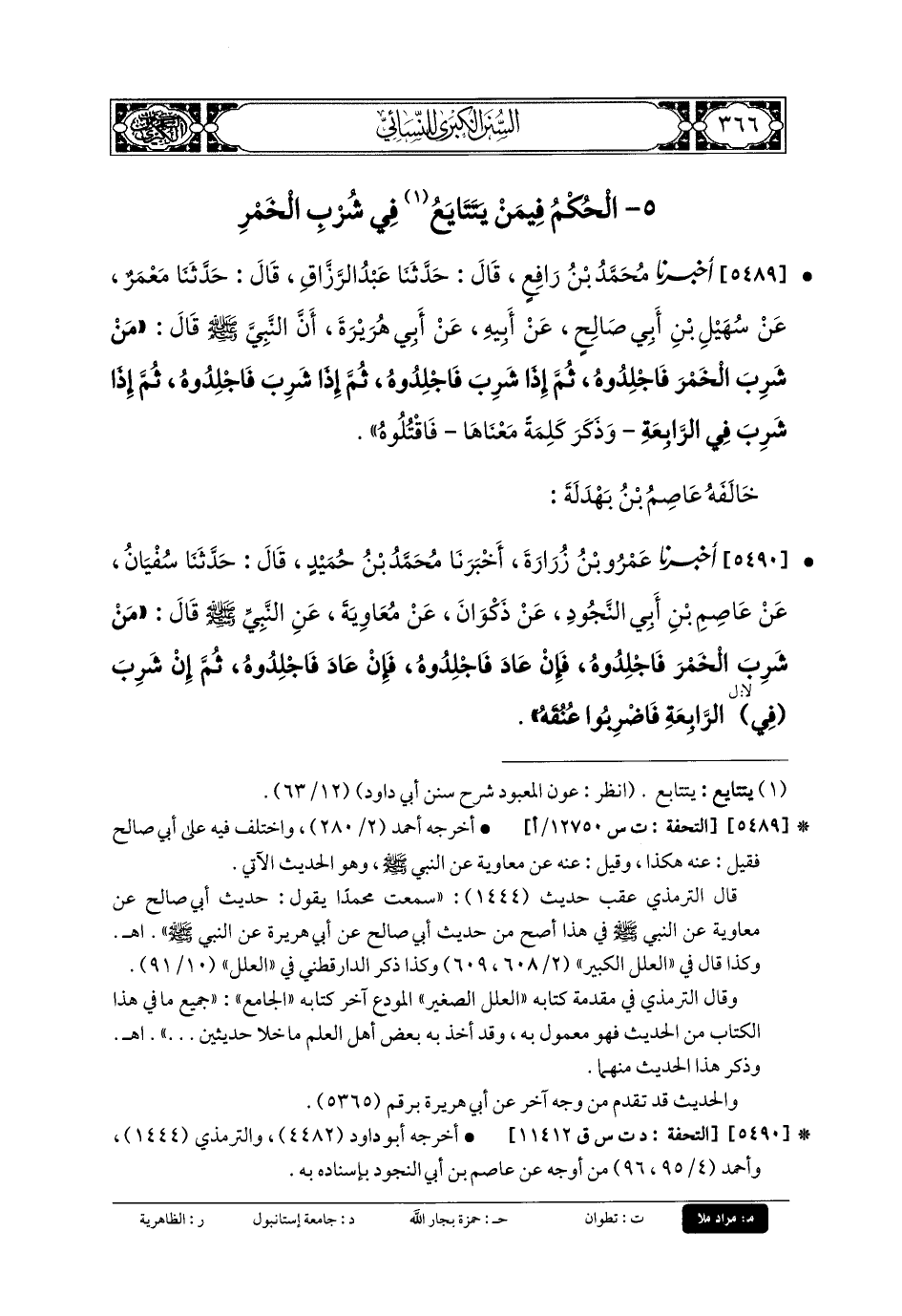 5490- أَخبَرنا عَمْرُو بنُ زُرَارَةَ، أَخبَرنا مُحَمدُ بنُ حُمَيْدٍ، قَالَ: حَدَّثنا سُفيانُ، عَن عَاصِمِ بنِ أَبي النَّجُودِ، عَن ذَكْوَانَ، عَن مُعاويَةَ، عَنِ النَّبيِّ صَلى الله عَلَيهِ وسَلم قَالَ: مَنْ شَرِبَ الخَمْرَ فَاجْلِدُوهُ، فَإِنْ عَادَ فَاجْلِدُوهُ، فَإِنْ عَادَ فَاجْلِدُوهُ، ثُمَّ إِنْ شَرِبَ فِي الرَّابِعَةِ، فَاضْرِبُوا عُنُقَهُ.