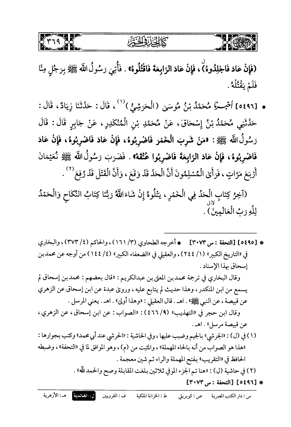 5496 - أَخبَرنا مُحَمدُ بنُ مُوسَى الحَرَشِيُّ، قَالَ: حَدَّثنا زِيَادٌ، قَالَ: حَدَّثني مُحَمدُ بنُ إِسحَاقَ، عَن مُحَمدِ بنِ المُنْكَدِرِ، عَن جَابِرٍ، قَالَ: قَالَ رَسُولُ اللهِ صَلى الله عَلَيهِ وسَلم: مَنْ شَرِبَ الخَمْرَ فَاضْرِبُوهُ، فَإِنْ عَادَ فَاضْرِبُوهُ، فَإِنْ عَادَ فَاضْرِبُوهُ، فَإِنْ عَادَ الرَّابِعَةَ فَاضْرِبُوا عُنُقَهُ، فَضَرَبَ رَسُولُ اللهِ صَلى الله عَلَيهِ وسَلم نُعَيْمَانَ أَرْبَعَ مَرَّاتٍ، فَرَأَى المُسْلِمُونَ أَنَّ الحَدَّ قَدْ وَقَعَ، وَأَنَّ القَتْلَ قَدْ رُفِعَ.