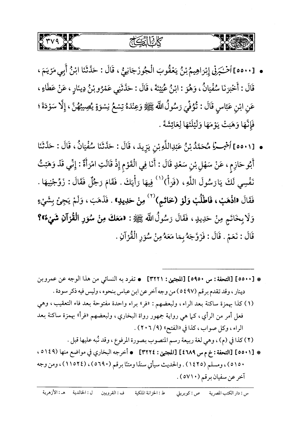 5501- أَخبَرنا مُحَمدُ بنُ عَبدِ اللهِ بنِ يَزِيدَ، قَالَ: حَدَّثنا سُفيانُ، قَالَ: حَدَّثنا أَبو حَازِمٍ، عَن سَهْلِ بنِ سَعْدٍ، قَالَ: أَنَا فِي القَوْمِ، إِذْ قَالَتِ امْرَأَةٌ: إِنِّي قَدْ وَهَبْتُ نَفْسِي لَكَ يَا رَسُولَ اللهِ، فَرَأْ فِيهَا رَأْيَكَ، فَقَامَ رَجُلٌ، فَقَالَ: زَوِّجْنِيهَا، فَقَالَ: اذْهَبْ فَاطْلُبْ وَلَوْ خَاتَمِ مِنْ حَدِيدٍ، فَذَهَبَ وَلَمْ يَجِئْ بِشَيْئٍ وَلا بِخَاتَمٍ مِنْ حَدِيدٍ، فَقَالَ رَسُولُ اللهِ صَلى الله عَلَيهِ وسَلم: مَعَكَ مِنْ سُوَرِ القُرْآنِ شَيْءٌ؟ قَالَ: نَعَمْ، قَالَ: فَزَوَّجَهُ بِمَا مَعَهُ مِنْ سُوَرِ القُرْآنِ.