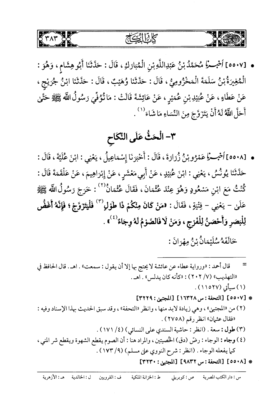 5508- أَخبَرنا عَمْرُو بنُ زُرَارَةَ، قَالَ: أَخبَرنا إِسمَاعِيلُ، يَعْنِي ابْنَ عُلَيَّةَ، قَالَ: حَدَّثنا يُونُسُ، يَعْنِي ابْنَ عُبَيْدٍ (1)، عَن أَبي مَعْشَرٍ، عَن إِبْرَاهِيمَ، عَن عَلْقَمَةَ، قَالَ: كُنْتُ مَعَ ابْنِ مَسْعُودٍ وَهُوَ عِنْدَ عُثْمَانَ، فَقَالَ عُثْمَانُ: خَرَجَ رَسُولُ اللهِ صَلى الله عَلَيهِ وسَلم عَلَى، يَعْنِي فِتْيَةٍ، فَقَالَ: مَنْ كَانَ مِنْكُمْ ذَا طَوْلٍ، فَلْيَتَزَوَّجْ، فَإِنَّهُ أَغَضُّ لِلْبَصَرِ وَأَحْصَنُ لِلْفَرْجِ، وَمَنْ لا، فَالصَّوْمُ لَهُ وِجَاءٌ.
