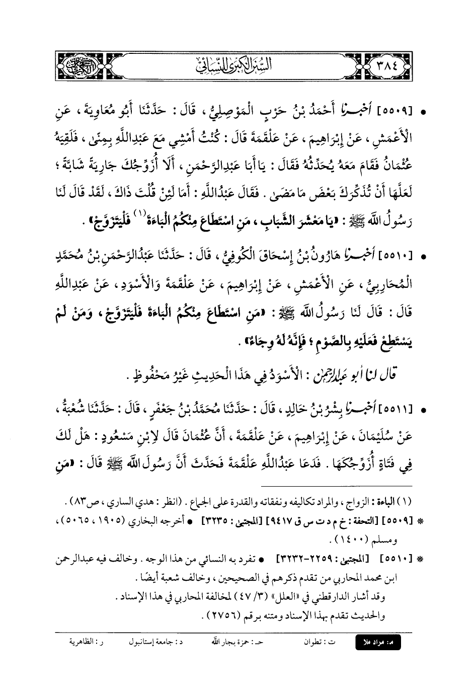 5509- أَخبَرنا أَحْمَدُ بنُ حَرْبٍ المَوْصِلِيُّ، قَالَ: حَدَّثنا أَبو مُعاويَةَ، عَنِ الأَعْمَشِ، عَن إِبْرَاهِيمَ، عَن عَلْقَمَةَ، قَالَ: كُنْتُ أَمْشِي مَعَ عَبدِ اللهِ بِمِنًى، فَلَقِيَهُ عُثْمَانُ، فَقَامَ مَعَهُ يُحَدِّثُهُ فَقَالَ: يَا أَبَا عَبدِ الرَّحمَنِ، أَلا أُزَوِّجُكَ جَارِيَةً شَابَّةً، لَعَلَّهَا أَنْ تُذَكِّرَكَ بَعْضَ مَا مَضَى، فَقَالَ عَبدُ اللهِ: أَمَّا لَئِنْ قُلْتَ ذَاكَ، لَقَدْ قَالَ لَنَا رَسُولُ اللهِ صَلى الله عَلَيهِ وسَلم: يَا مَعْشَرَ الشَّبَابِ مَنِ اسْتَطَاعَ مِنْكُمُ البَاءَةَ فَلْيَتَزَوَّجْ.