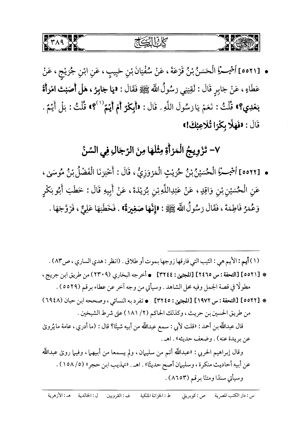 5521- أَخبَرنا الحَسَنُ بنُ قَزْعَةَ، عَن سُفيانَ بْنَ حَبِيبٍ، عَنِ ابْنِ جُرَيْجٍ، عَن عَطَاءٍ، عَن جَابِرٍ، قَالَ: لَقِيَنِي رَسُولُ اللهِ صَلى الله عَلَيهِ وسَلم، فَقَالَ: يَا جَابِرُ، هَلْ أَصَبْتَ امْرَأَةً بَعْدِي؟ قُلْتُ: نَعَمْ يَا رَسُولَ اللهِ، قَالَ: أَبِكْرٌ أَمْ أَيِّمٌ؟ قُلْتُ: بَلْ أَيِّمٌ، قَالَ: فَهَلاَّ بِكْرًا تُلاعِبُكَ؟.