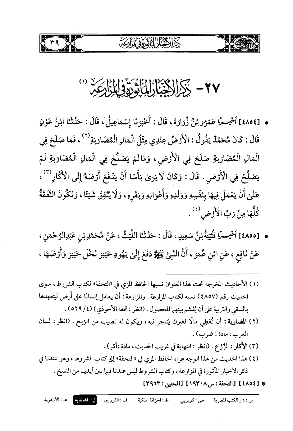 27 - ذِكْرُ الأَخْبَارِ المَأْثُورَةِ فِي المُزَارَعَةِ.