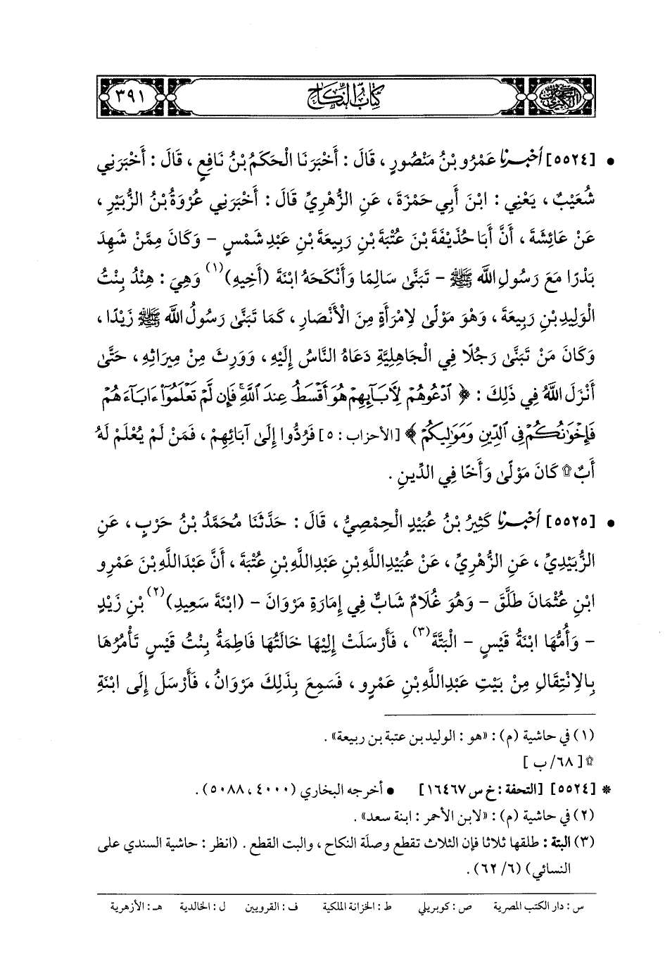 5524- أَخبَرنا عَمْرُو بنُ مَنْصُورٍ، قَالَ: أَخبَرنا الحَكَمُ بنُ نَافِعٍ، قَالَ: أَخْبَرَنِي شُعَيْبٌ، يَعْنِي ابْنَ أَبي حَمْزَةَ، عَنِ الزُّهْرِيِّ، قَالَ: أَخْبَرَنِي عُرْوَةُ بنُ الزُّبَيْرِ، عَن عَائِشَةَ، أَنَّ أَبَا حُذَيْفَةَ بْنَ عُتْبَةَ بنِ رَبِيعَةَ بنِ عَبدِ شَمْسٍ، وَكَانَ مِمَّنْ شَهِدَ بَدْرًا مَعَ رَسُولِ اللهِ صَلى الله عَلَيهِ وسَلم تَبَنَّى سَالِمًا، وَأَنْكَحَهُ ابْنَةَ أَخِيهِ، وَهِيَ هِنْدُ بِنْتُ الوَلِيدِ بنِ رَبِيعَةَ، وَهُوَ مَوْلًى لاِمْرَأَةٍ مِنَ الأَنْصَارِ، كَمَا تَبَنَّى رَسُولُ اللهِ صَلى الله عَلَيهِ وسَلم زَيْدًا، وَكَانَ مَنْ تَبَنَّى رَجُلاً فِي الجَاهِلِيَّةِ دَعَاهُ النَّاسُ إِلَيْهِ، وَوَرِثَ مِنْ مِيرَاثِهِ، حَتَّى أَنْزَلَ اللهُ فِي ذَلِكَ: {ادْعُوهُمْ لآبَائِهِمْ هُوَ أَقْسَطُ عِنْدَ اللهِ فَإِنْ لَمْ تَعْلَمُوا آبَاءَهُمْ فَإِخْوَانُكُمْ فِي الدِّينِ وَمَوَالِيكُمْ}، فَرُدُّوا إِلَى آبَائِهِمْ، فَمَنْ لَمْ يُعْلَمْ لَهُ أَبٌ، كَانَ مَوْلًى وَأَخًا فِي الدِّينِ.