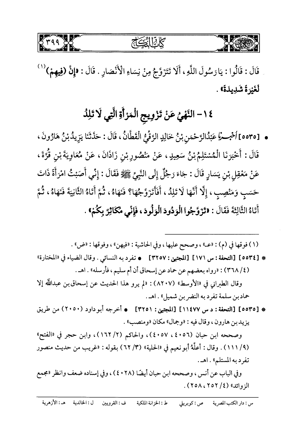 5535- أَخبَرنا عَبدُ الرَّحمَنِ بنُ خَالِدٍ الرَّقِّيُّ القَطَّانُ، قَالَ: حَدَّثنا يَزِيدُ بنُ هَارُونَ، قَالَ: أَخبَرنا المُسْتَلِمُ بنُ سَعِيدٍ، عَن مَنْصُورِ بنِ زَاذَانَ، عَن مُعاويَةَ بنِ قُرَّةَ، عَن مَعْقِلِ بنِ يَسَارٍ، قَالَ: جَاءَ رَجُلٌ إِلَى النَّبيِّ صَلى الله عَلَيهِ وسَلم، فَقَالَ: إِنِّي أَصَبْتُ امْرَأَةً ذَاتَ حَسَبٍ وَمَنْصِبٍ، إِلاَّ أَنَّهَا لا تَلِدُ، أَفَأَتَزَوَّجُهَا؟ فَنَهَاهُ، ثُمَّ أَتَاهُ الثَّانِيَةَ، فَنَهَاهُ، ثُمَّ أَتَاهُ الثَّالِثَةَ، فَقَالَ: تَزَوَّجُوا الوَدُودَ الوَلُودَ، فَإِنِّي مُكَاثِرٌ بِكُمْ.
