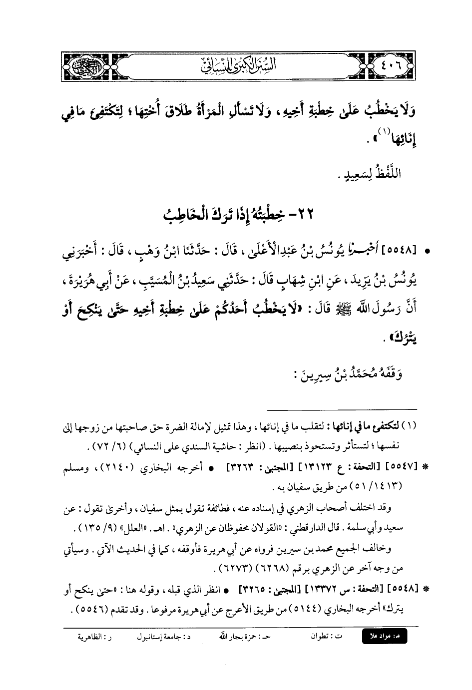 5548- أَخبَرنا يُونُسُ بنُ عَبدِ الأَعْلَى، قَالَ: حَدَّثنا ابْنُ وَهْبٍ، قَالَ: أَخْبَرَنِي يُونُسُ بنُ يَزِيدَ، عَنِ ابْنِ شِهَابٍ، قَالَ: حَدَّثني سَعِيدُ بنُ المُسَيَّبِ، عَن أَبي هُرَيْرَةَ، أَنَّ رَسُولَ اللهِ صَلى الله عَلَيهِ وسَلم قَالَ: لا يَخْطُبُ أَحَدُكُمْ عَلَى خِطْبَةِ أَخِيهِ حَتَّى يَنْكِحَ أَوْ يَتْرُكَ.