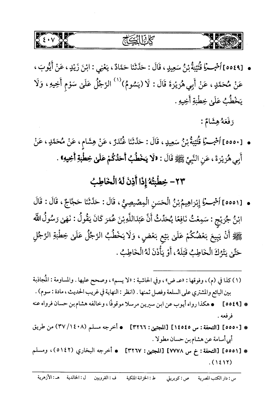 5550- أَخبَرنا قُتَيبَةُ بنُ سَعِيدٍ، قَالَ: حَدَّثنا غُنْدَرٌ، عَن هِشَامٍ، عَن مُحَمدٍ، عَن أَبي هُرَيْرَةَ، عَنِ النَّبيِّ صَلى الله عَلَيهِ وسَلم قَالَ: لا يَخْطُبْ أَحَدُكُمْ عَلَى خِطْبَةِ أَخِيهِ.