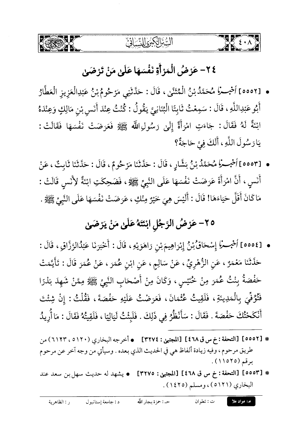 5552- أَخبَرنا مُحَمدُ بنُ المُثَنَّى، قَالَ: حَدَّثني مَرْحُومُ بنُ عَبدِ العَزِيزِ العَطَّارُ أَبو عَبدِ اللهِ، قَالَ: سَمِعْتُ ثَابِتًا البُنَانِيَّ يَقُولُ: كُنْتُ عِنْدَ أَنَسِ بنِ مَالِكٍ، وَعِنْدَهُ ابْنَةٌ لَهُ، فَقَالَ: جَاءَتِ امْرَأَةٌ إِلَى رَسُولِ اللهِ صَلى الله عَلَيهِ وسَلم فَعَرَضَتْ نَفْسَهَا، فَقَالَتْ: يَا رَسُولَ اللهِ، أَلَكَ فِيَّ حَاجَةٌ؟.