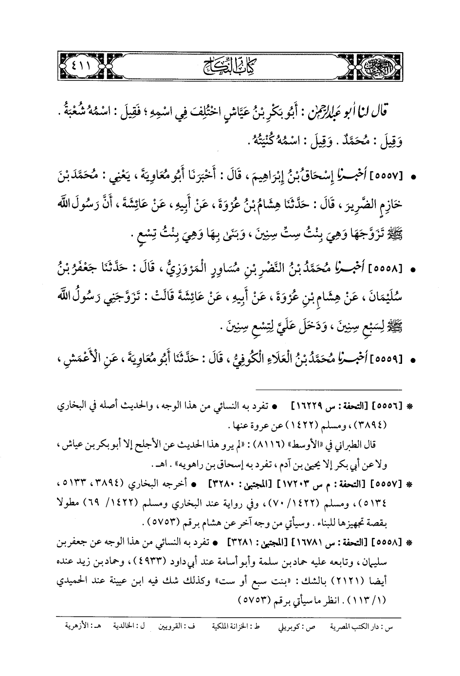 5557- أَخبَرنا إِسحَاقُ بنُ إِبْرَاهِيمَ، قَالَ: أَخبَرنا أَبو مُعاويَةَ، يَعْنِي مُحَمدَ بْنَ خَازِمٍ (1) الضَّرِيرَ، قَالَ: حَدَّثنا هِشَامُ بنُ عُرْوَةَ، عَن أَبيهِ، عَن عَائِشَةَ، أَنَّ رَسُولَ اللهِ صَلى الله عَلَيهِ وسَلم تَزَوَّجَهَا وَهِيَ بِنْتُ سِتِّ سِنِينَ، وَبَنَى بِهَا وَهِيَ بِنْتُ تِسْعٍ.