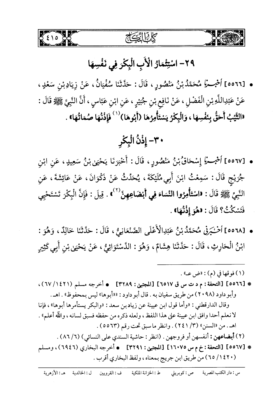 (1) تصحف في طبعة التأصيل إلى:"تُسْتَأْمَر»، وقال محققو طبعة التأصيل: «كذا في (م) وهو وهم، والصواب "تُسْتَأْذَنَ» كما في «المُجتبى» طبعة التأصيل (3292).