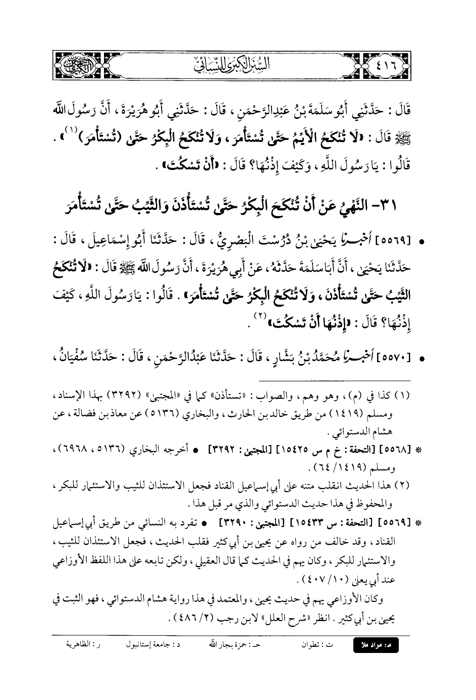 5569- أَخبَرنا يَحْيَى بنُ دُرُسْتَ البَصْرِيُّ، قَالَ: حَدَّثنا أَبو إِسمَاعِيلَ، قَالَ: حَدَّثنا يَحْيَى، أَنَّ أَبَا سَلَمَةَ حَدَّثَهُ عَن أَبي هُرَيْرَةَ، أَنَّ رَسُولَ اللهِ صَلى الله عَلَيهِ وسَلم قَالَ: لا تُنْكَحُ الثَّيِّبُ حَتَّى تُسْتَأْذَنَ، وَلا تُنْكَحُ البِكْرُ حَتَّى تُسْتَأْمَرَ، قَالُوا: يَا رَسُولَ اللهِ، كَيْفَ إِذْنُهَا؟ قَالَ: إِذْنُهَا أَنْ تَسْكُتَ.
