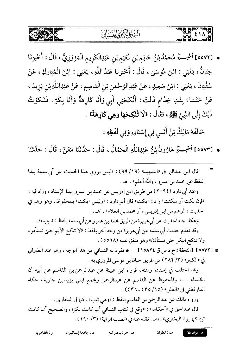 5572- أَخبَرنا مُحَمدُ بنُ حَاتِمِ بنِ نُعَيْمِ بنِ عَبدِ الكَرِيمِ المَرْوَزِيُّ، قَالَ: أَخبَرنا حِبَّانُ، يَعْنِي ابْنَ مُوسَى، قَالَ: أَخبَرنا عَبدُ اللهِ، يَعْنِي ابْنَ المُبَارَكِ، عَن سُفيانَ، يَعْنِي ابْنَ سَعِيدٍ، عَن عَبدِ الرَّحمَنِ بنِ القَاسِمِ، عَن عَبدِ اللهِ بنِ يَزِيدَ، عَن خَنْسَاءَ بِنْتِ خِذَامٍ، قَالَتْ: أَنْكَحَنِي أَبي وَأَنَا كَارِهَةٌ، وَأَنَا بِكْرٌ، فَشَكَوْتُ ذَلِكَ إلَى النَّبِيِّ صَلى الله عَلَيهِ وسَلم، فَقَالَ: لا تُنْكِحْهَا وَهِيَ كَارِهَةٌ.
