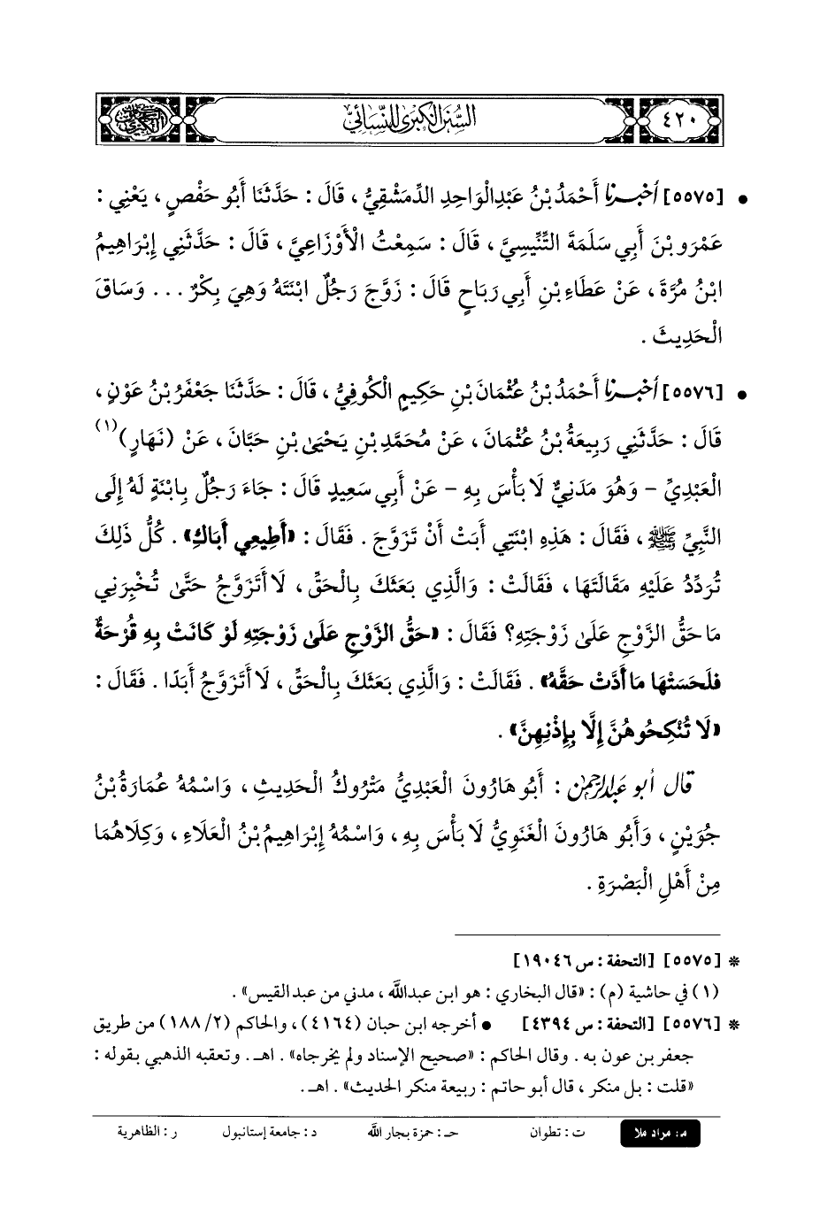 5576- أَخبَرنا أَحْمَدُ بنُ عُثْمَانَ بنِ حَكِيمٍ الكُوفِيُّ، قَالَ: حَدَّثنا جَعْفَرُ بنُ عَوْنٍ، قَالَ: حَدَّثني رَبِيعَةُ بنُ عُثْمَانَ، عَن مُحَمدِ بنِ يَحْيَى بنِ حَبَّانَ، عَن نَهَارٍ العَبدِيِّ، وَهُوَ مَدَنِيٌّ لا بَأْسَ بِهِ، عَن أَبي سَعِيدٍ، قَالَ: جَاءَ رَجُلٌ بِابْنَةٍ لَهُ إِلَى النَّبيِّ صَلى الله عَلَيهِ وسَلم، فَقَالَ: هَذِهِ ابْنَتِي أَبَتْ أَنْ تَزَوَّجَ، فَقَالَ: أَطِيعِي أَبَاكِ، كُلُّ ذَلِكَ تُرَدِّدُ عَلَيْهِ مَقَالَتَهَا، فَقَالَتْ: وَالَّذِي بَعَثَكَ بِالحَقِّ لا أَتَزَوَّجُ حَتَّى تُخْبِرَنِي مَا حَقُّ الزَّوْجِ عَلَى زَوْجَتِهِ، فَقَالَ: حَقُّ الزَّوْجِ عَلَى زَوْجَتِهِ لَوْ كَانَتْ بِهِ قُرْحَةٌ فَلَحَسَتْهَا مَا أَدَّتْ حَقَّهُ، فَقَالَتْ: وَالَّذِي بَعَثَكَ بِالحَقِّ لا أَتَزَوَّجُ أَبَدًا، فَقَالَ: لا تُنْكِحُوهُنَّ إِلاَّ بِإِذْنِهِنَّ.