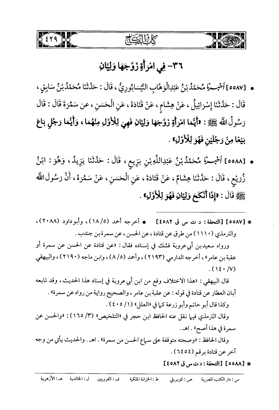 5587- أَخبَرنا مُحَمدُ بنُ عَبدِ الوَهَّابِ النَّيْسَابُورِيُّ، قَالُ: حَدَّثنا مُحَمدُ بنُ سَابَقٍ، قَالَ: حَدَّثنا إِسرَائِيلُ، عَن هِشَامٍ، عَن قَتَادَةَ، عَنِ الحَسَنِ، عَن سَمُرَةَ، قَالَ: قَالَ رَسُولُ اللهِ صَلى الله عَلَيهِ وسَلم: أَيُّمَا امْرَأَةٍ زَوَّجَهَا وَلِيَّانِ فَهِيَ لِلأَوَّلِ مِنْهُمَا، وَأَيُّمَا رَجُلٍ بَاعَ بَيْعًا مِنْ رَجُلَيْنِ فَهُوَ لِلأَوَّلِ.