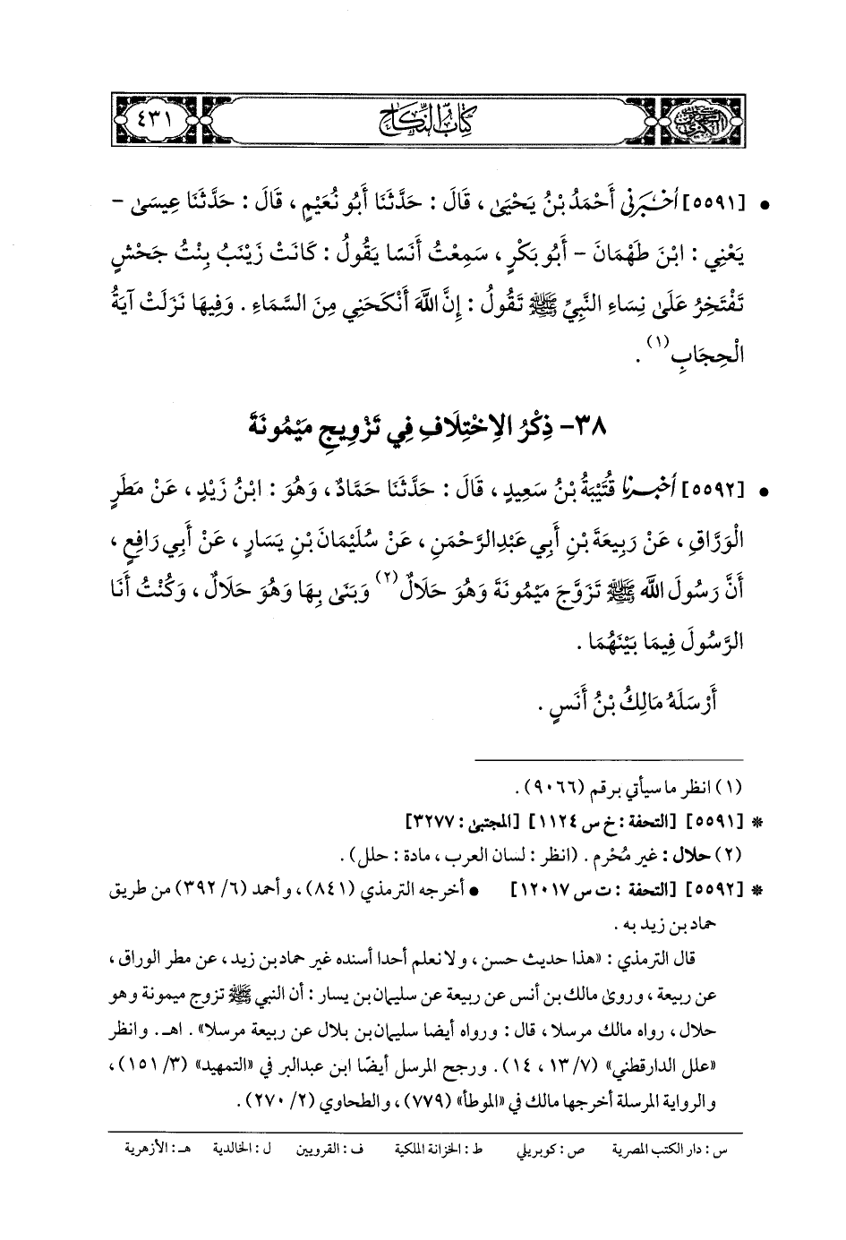 5592- أَخبَرنا قُتَيبَةُ بنُ سَعِيدٍ، قَالَ: حَدَّثنا حَمَّادٌ، وَهُوَ ابْنُ زَيْدٍ، عَن مَطَرٍ الوَرَّاقِ، عَن رَبِيعَةَ بنِ أَبي عَبدِ الرَّحمَنِ، عَن سُلَيْمَانَ بنِ يَسَارٍ، عَن أَبي رَافِعٍ، أَنَّ رَسُولَ اللهِ صَلى الله عَلَيهِ وسَلم تَزَوَّجَ مَيْمُونَةَ وَهُوَ حَلالٌ، وَبَنَى بِهَا وَهُوَ حَلالٌ، وَكُنْتُ أَنَا الرَّسُولَ فِيمَا بَيْنَهُمَا.