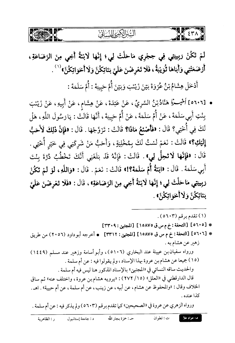 5606- أَخبَرنا هَنَّادُ بنُ السَّرِيِّ، عَن عَبدَةَ، عَن هِشَامٍ، عَن أَبيهِ، عَن زَيْنَبَ بِنْتِ أَبي سَلَمَةَ، عَن أُمِّ سَلَمَةَ، عَن أُمِّ حَبِيبَةَ، أَنَّهَا قَالَتْ: يَا رَسُولَ اللهِ، هَلْ لَكَ فِي أُخْتِي؟ قَالَ: فَأَصْنَعُ مَاذَا؟ قَالَتْ: تَزَوَّجْهَا، قَالَ: فَإِنَّ ذَلِكَ لأََحَبُّ إِلَيْكِ؟ قَالَتْ: نَعَمْ لَسْتُ لَكَ بِمُخْلِيَةٍ، وَأَحَبُّ مَنْ شَرِكَنِي فِي خَيْرٍ أُخْتِي، قَالَ: فَإِنَّهَا لا تَحِلُّ لِي، قَالَتْ: فَإِنَّهُ قَدْ بَلَغَنِي أَنَّكَ تَخْطُبُ دُرَّةَ بِنْتَ أَبي سَلَمَةَ، قَالَ: ابْنَةَ أُمِّ سَلَمَةَ؟ قَالَتْ: نَعَمْ، قَالَ: وَاللهِ لَوْ لَمْ تَكُنْ رَبِيبَتِي مَا حَلَّتْ لِي، إِنَّهَا لابْنَةُ أَخِي مِنَ الرَّضَاعَةِ، قَالَ: فَلا تَعْرِضْنَ عَلَيَّ بَنَاتِكُنَّ وَلا أَخَوَاتِكُنَّ.