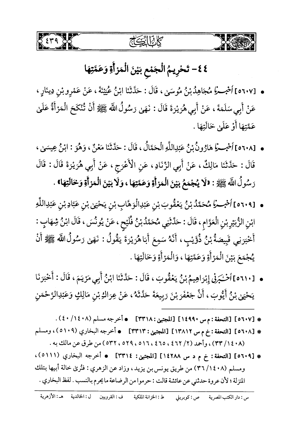 5610- أَخْبَرَنِي إِبْرَاهِيمُ بنُ يَعْقُوبَ، قَالَ: حَدَّثنا ابْنُ أَبي مَرْيَمَ، قَالَ: أَخبَرنا يَحْيَى بنُ أَيوبَ، أَنَّ جَعْفَرَ بْنَ رَبِيعَةَ حَدَّثَهُ عَن عِرَاكِ بنِ مَالِكٍ، وَعَبدِ الرَّحمَنِ الأَعْرَجُ، عَن أَبي هُرَيْرَةَ، عَن رَسُولِ اللهِ صَلى الله عَلَيهِ وسَلم أَنَّهُ نَهَى أَنْ تُنْكَحَ المَرْأَةُ عَلَى عَمَّتِهَا أَوْ خَالَتِهَا.