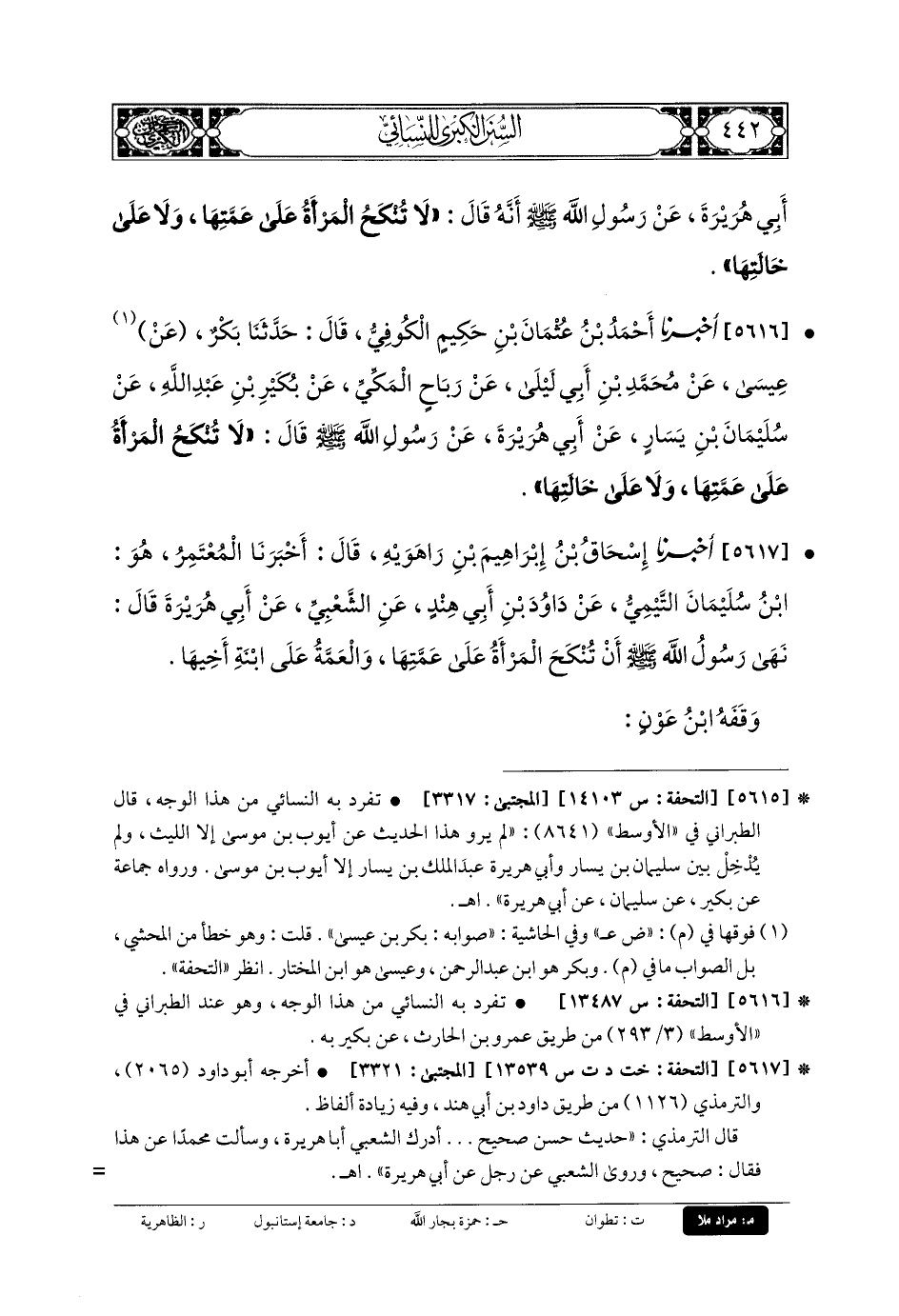 5616- أَخبَرنا أَحْمَدُ بنُ عُثْمَانَ بنِ حَكِيمٍ الكُوفِيُّ، قَالَ: حَدَّثنا بَكْرٌ، عَن عِيسَى، عَن مُحَمدِ بنِ أَبي لَيْلَى، عَن رَبَاحٍ المَكِّيِّ، عَن بُكَيْرِ بنِ عَبدِ اللهِ، عَن سُلَيْمَانَ بنِ يَسَارٍ، عَن أَبي هُرَيْرَةَ، عَن رَسُولِ اللهِ صَلى الله عَلَيهِ وسَلم قَالَ: لا تُنْكَحُ المَرْأَةُ عَلَى عَمَّتِهَا، وَلا عَلَى خَالَتِهَا.