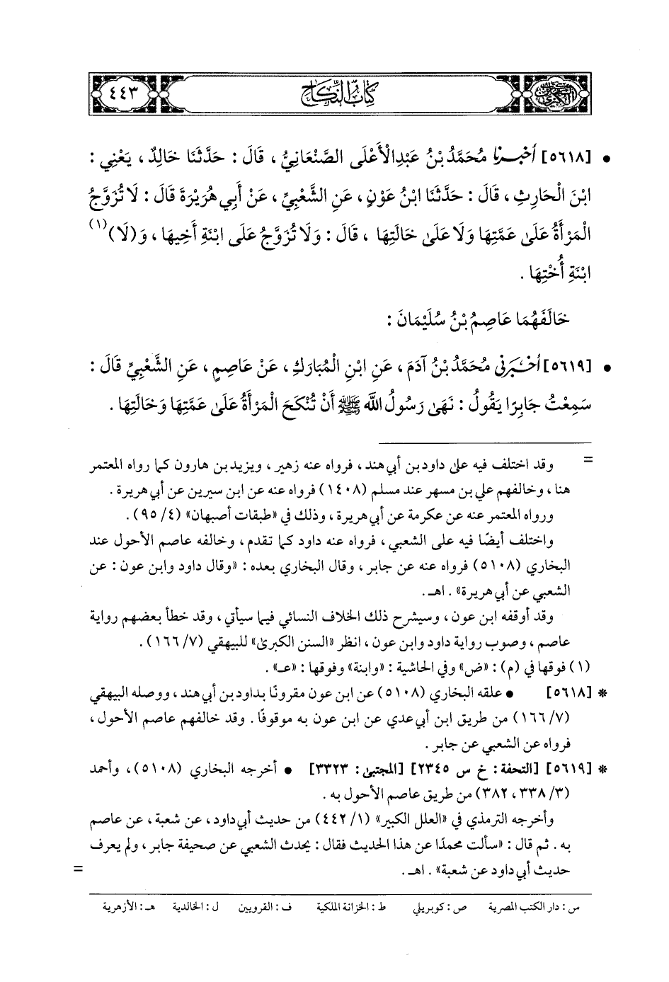 5619- أَخْبَرَنِي مُحَمدُ بنُ آدَمَ، عَنِ ابْنِ المُبَارَكِ، عَن عَاصِمٍ، عَنِ الشَّعْبِيِّ، قَالَ: سَمِعْتُ جَابِرًا يَقُولُ: نَهَى رَسُولُ اللهِ صَلى الله عَلَيهِ وسَلم أَنْ تُنْكَحَ المَرْأَةُ عَلَى عَمَّتِهَا وَخَالَتِهَا.