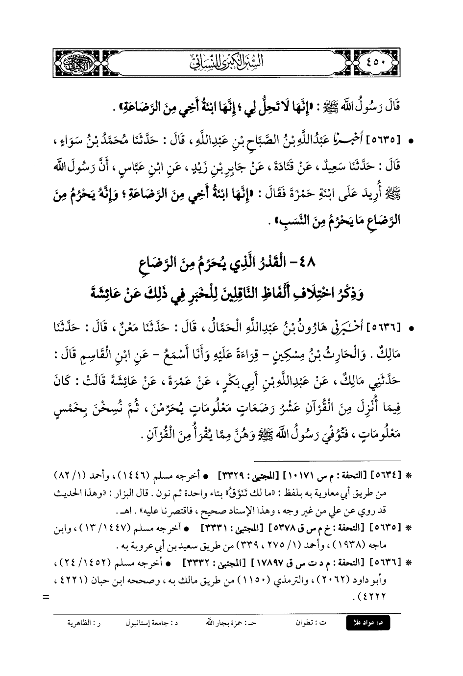 5635- أَخبَرنا عَبدُ اللهِ بنُ الصَّبَّاحِ بنِ عَبدِ اللهِ، قَالَ: حَدَّثنا مُحَمدُ بنُ سَوَاءٍ، قَالَ: حَدَّثنا سَعِيدٌ، عَن قَتَادَةَ، عَن جَابِرِ بنِ زَيْدٍ، عَنِ ابْنِ عَبَّاسٍ، أَنَّ رَسُولَ اللهِ صَلى الله عَلَيهِ وسَلم أُرِيدَ عَلَى ابْنَةِ حَمْزَةَ، فَقَالَ: إِنَّهَا ابْنَةُ أَخِي مِنَ الرَّضَاعَةِ، وَإِنَّهُ يَحْرُمُ مِنَ الرَّضَاعِ مَا يَحْرُمُ مِنَ النَّسَبِ.