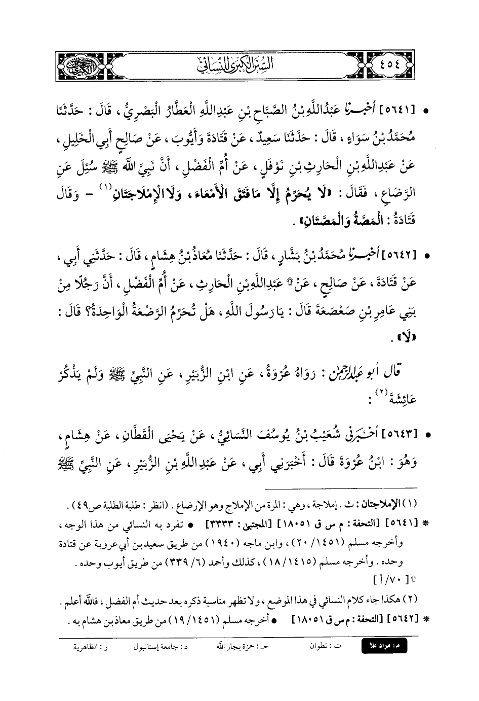 5643- أَخْبَرَنِي شُعَيْبُ بنُ يُوسُفَ النَّسَائِيُّ، عَن يَحْيَى القَطَّانِ، عَن هِشَامٍ، وَهُوَ ابْنُ عُرْوَةَ، قَالَ: أَخْبَرَنِي أَبي، عَن عَبدِ اللهِ بنِ الزُّبَيْرِ، عَنِ النَّبيِّ صَلى الله عَلَيهِ وسَلم قَالَ: لا تُحَرِّمُ المَصَّةُ، وَالمَصَّتَانِ.