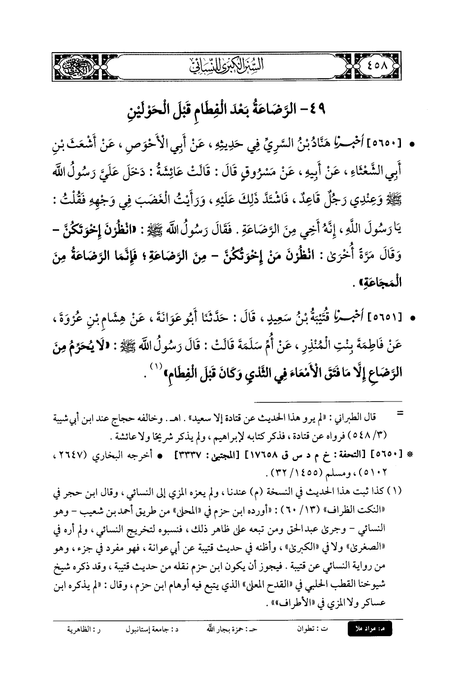 5650- أَخبَرنا هَنَّادُ بنُ السَّرِيِّ فِي حَدِيثِهِ، عَن أَبي الأَحْوَصِ، عَن أَشْعَثَ بنِ أَبي الشَّعْثَاءِ، عَن أَبيهِ، عَن مَسْرُوقٍ، قَالَ: قَالَتْ عَائِشَةُ: دَخَلَ عَلَيَّ رَسُولُ اللهِ صَلى الله عَلَيهِ وسَلم وَعِنْدِي رَجُلٌ قَاعِدٌ، فَاشْتَدَّ ذَلِكَ عَلَيْهِ، وَرَأَيْتُ الغَضَبَ فِي وَجْهِهِ، فَقُلْتُ: يَا رَسُولَ اللهِ، إِنَّهُ أَخِي مِنَ الرَّضَاعَةِ، فَقَالَ رَسُولُ اللهِ صَلى الله عَلَيهِ وسَلم: انْظُرْنَ إِخْوَتَكُنَّ، وَقَالَ مَرَّةً أُخْرَى: انْظُرْنَ مَنْ إِخْوَتُكُنَّ مَنْ الرَّضَاعَةِ، فَإِنَّمَا الرَّضَاعَةُ مِنَ المَجَاعَةِ.