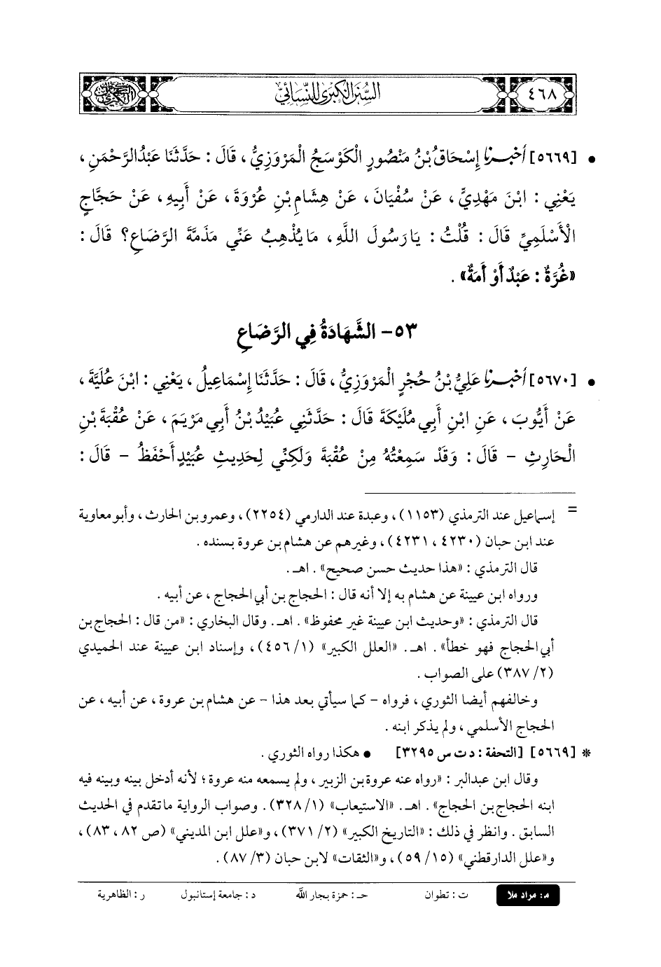5669- أَخبَرنا إِسحَاقُ بنُ مَنْصُورٍ الكَوْسَجُ المَرْوَزِيُّ، قَالَ: حَدَّثنا عَبدُ الرَّحمَنِ، يَعْنِي ابْنَ مَهْدِيٍّ، عَن سُفيانَ، عَن هِشَامِ بنِ عُرْوَةَ، عَن أَبيهِ، عَن حَجَّاجٍ الأَسْلَمِيِّ، قَالَ: قُلْتُ: يَا رَسُولَ اللهِ، مَا يُذْهِبُ عَنِّي مَذَمَّةَ الرَّضَاعِ؟ قَالَ: غُرَّةٌ عَبدٌ أَوْ أَمَةٌ.