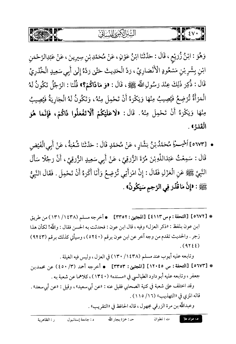 5673- أَخبَرنا مُحَمدُ بنُ بَشَّارٍ، عَن مُحَمدٍ، قَالَ: حَدَّثنا شُعْبَةُ، عَن أَبي الفَيْضِ، قَالَ: سَمِعْتُ عَبدَ اللهِ بْنَ مُرَّةَ الزُّرَقِيَّ، عَن أَبي سَعِيدٍ الزُّرَقِيِّ، أَنَّ رَجُلاً سَأَلَ النَّبيَّ صَلى الله عَلَيهِ وسَلم عَنِ العَزْلِ، فَقَالَ: إِنَّ امْرَأَتِي تُرْضِعُ وَأَنَا أَكْرَهُ أَنْ تَحْمِلَ، فَقَالَ النَّبيُّ صَلى الله عَلَيهِ وسَلم: إِنَّ مَا قُدِّرَ فِي الرَّحِمِ سَيَكُونُ.
