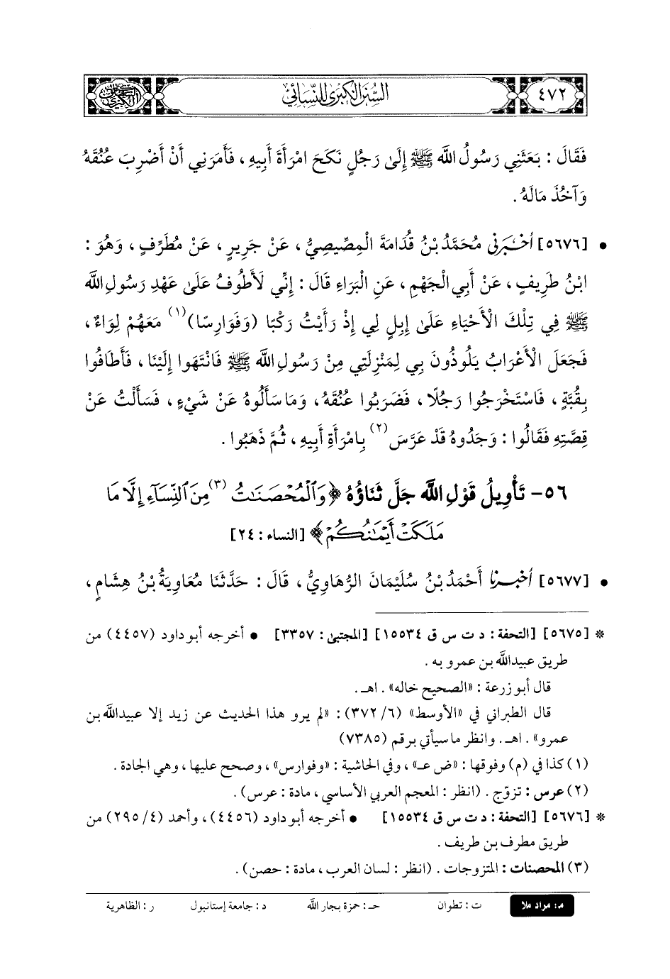5676- أَخبَرني مُحَمدُ بنُ قُدَامَةَ المِصِّيصِيُّ، عَن جَرِيرٍ، عَن مُطَرِّفٍ، وَهُوَ ابْنُ طَرِيفٍ، عَن أَبي الجَهْمِ، عَنِ البَرَاءِ، قَالَ: إِنِّي لأَطُوفُ عَلَى عَهْدِ رَسُولِ اللهِ صَلى الله عَلَيهِ وسَلم فِي تِلْكَ الأَحْيَاءِ عَلَى إِبِلٍ لِي، إِذْ رَأَيْتُ رَكْبًا وَفَوَارِسًا مَعَهُمْ لِوَاءٌ، فَجَعَلَ الأَعْرَابُ يَلُوذُونَ بِي لِمَنْزِلَتِي مِنْ رَسُولِ اللهِ صَلى الله عَلَيهِ وسَلم، فَانْتَهَوْا إِلَيْنَا، فَأَطَافُوا بِقُبَّةٍ فَاسْتَخْرَجُوا رَجُلاً فَضَرَبُوا عُنُقَهُ، وَمَا سَأَلُوهُ عَن شَيْءٍ، فَسَأَلْتُ عَن قِصَّتِهِ، فَقَالُوا: وَجَدُوهُ قَدْ عَرَّسَ بِامْرَأَةِ أَبيهِ، ثُمَّ ذَهَبُوا.