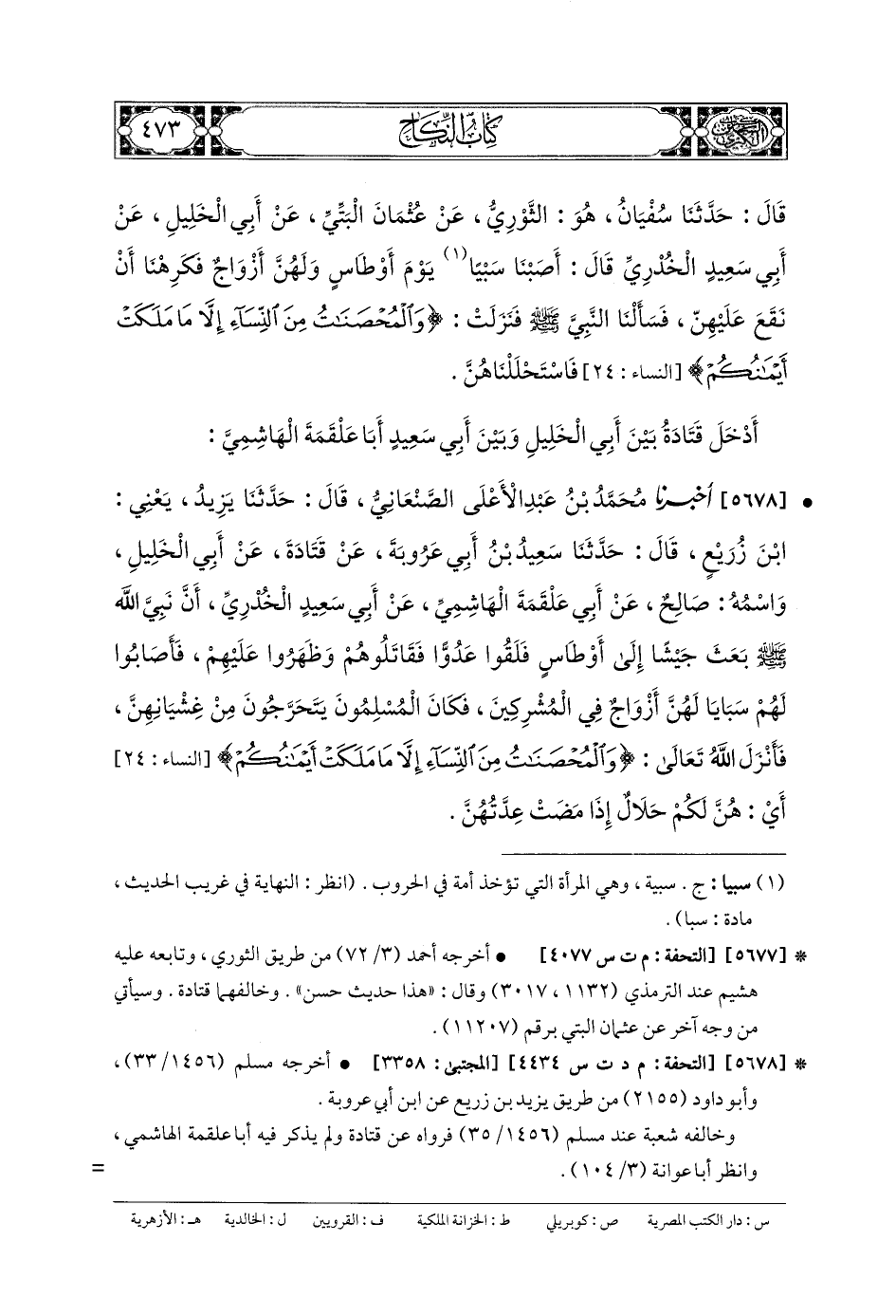 5678- أَخبَرنا مُحَمدُ بنُ عَبدِ الأَعْلَى الصَّنْعَانِيُّ، قَالَ: حَدَّثنا يَزِيدُ، يَعْنِي ابْنَ زُرَيْعٍ، قَالَ: حَدَّثنا سَعِيدُ بنُ أَبي عَرُوبَةَ، عَن قَتَادَةَ، عَن أَبي الخَلِيلِ، وَاسْمُهُ: صَالِحٌ، عَن أَبي عَلْقَمَةَ الهَاشِمِيِّ، عَن أَبي سَعِيدٍ الخُدْرِيِّ: أَنَّ نَبِيَّ اللهِ صَلى الله عَلَيهِ وسَلم بَعَثَ جَيْشًا إِلَى أَوْطَاسٍ، فَلَقُوا عَدُوًّا فَقَاتَلُوهُمْ وَظَهَرُوا عَلَيْهِمْ، فَأَصَابُوا لَهُمْ سَبَايَا، لَهُنَّ أَزْوَاجٌ فِي المُشْرِكِينَ، فَكَانَ المُسْلِمُونَ يَتَحَرَّجُونَ مِنْ غِشْيَانِهِنَّ، فَأَنْزَلَ اللهُ تَعَالَى: {وَالمُحْصَنَاتُ مِنَ النِّسَاءِ إِلاَّ مَا مَلَكَتْ أَيْمَانُكُمْ} أَيْ هُنَّ لَكُمْ حَلالٌ إِذَا مَضَتْ عِدَّتُهُنَّ.