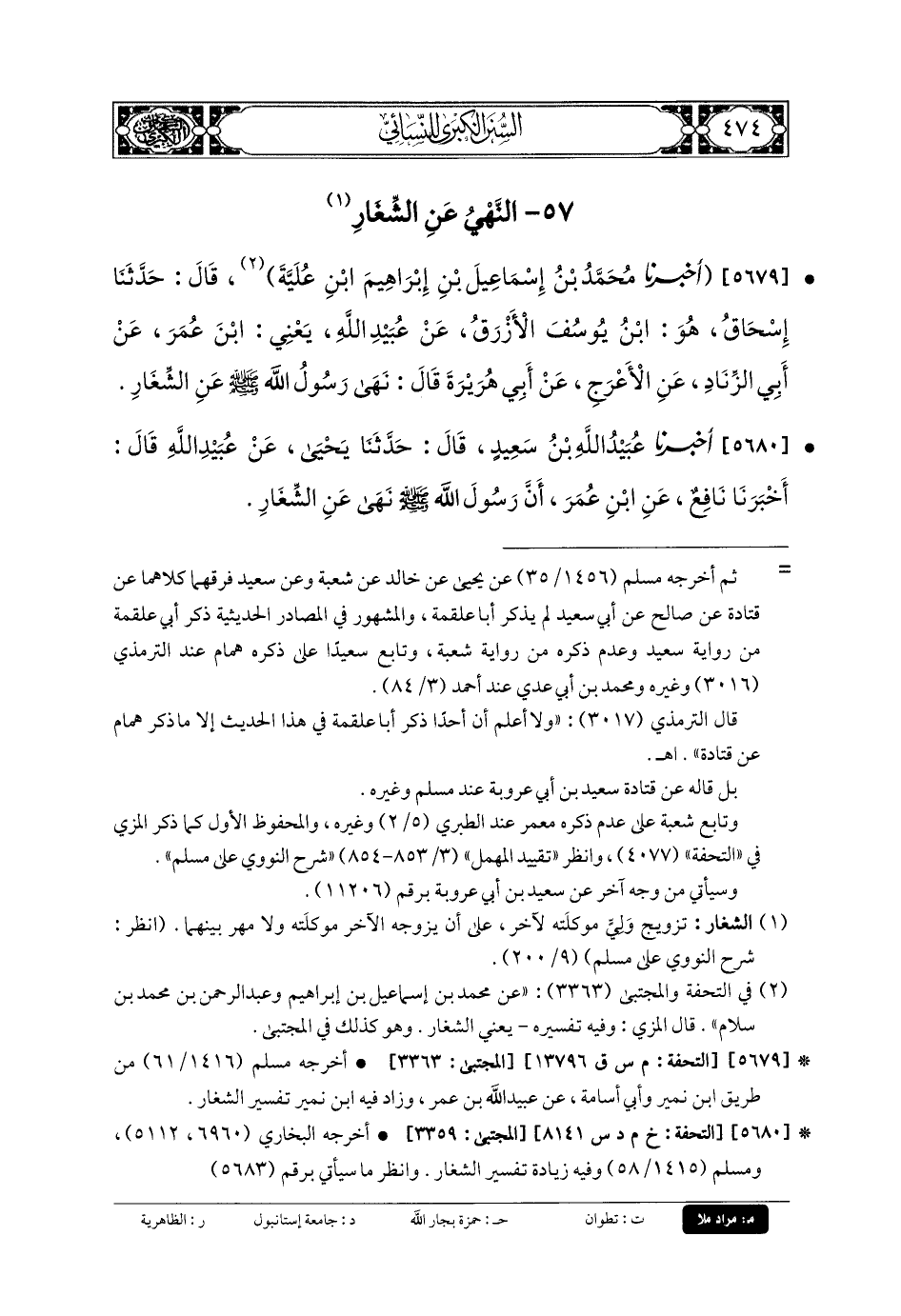 5679- أَخبَرنا مُحَمدُ بنُ إِسمَاعِيلَ بنِ إِبْرَاهِيمَ ابْنِ عُلَيَّةَ، قَالَ: حَدَّثنا إِسحَاقُ، هُوَ ابْنُ يُوسُفَ الأَزْرَقُ، عَن عُبَيْدِ اللهِ، يَعْنِي ابْنَ عُمَرَ، عَن أَبي الزِّنَادِ، عَنِ الأَعْرَجِ، عَن أَبي هُرَيْرَةَ، قَالَ: نَهَى رَسُولُ اللهِ صَلى الله عَلَيهِ وسَلم عَنِ الشِّغَارِ.