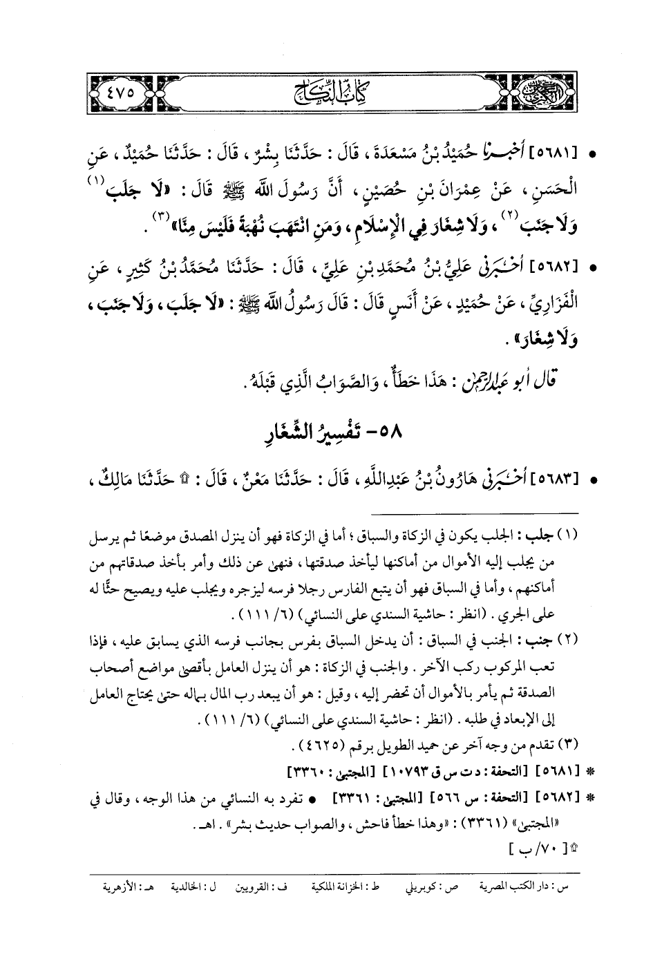 5681- أَخبَرنا حُمَيْدُ بنُ مَسْعَدَةَ، قَالَ: حَدَّثنا بِشْرٌ، قَالَ: حَدَّثنا حُمَيْدٌ، عَنِ الحَسَنِ، عَن عِمْرَانَ بنِ حُصَيْنٍ، أَنَّ رَسُولَ اللهِ صَلى الله عَلَيهِ وسَلم قَالَ: لا جَلَبَ، وَلا جَنَبَ، وَلا شِغَارَ فِي الإِسلامِ، وَمَنِ انْتَهَبَ نُهْبَةً فَلَيْسَ مِنَّا.