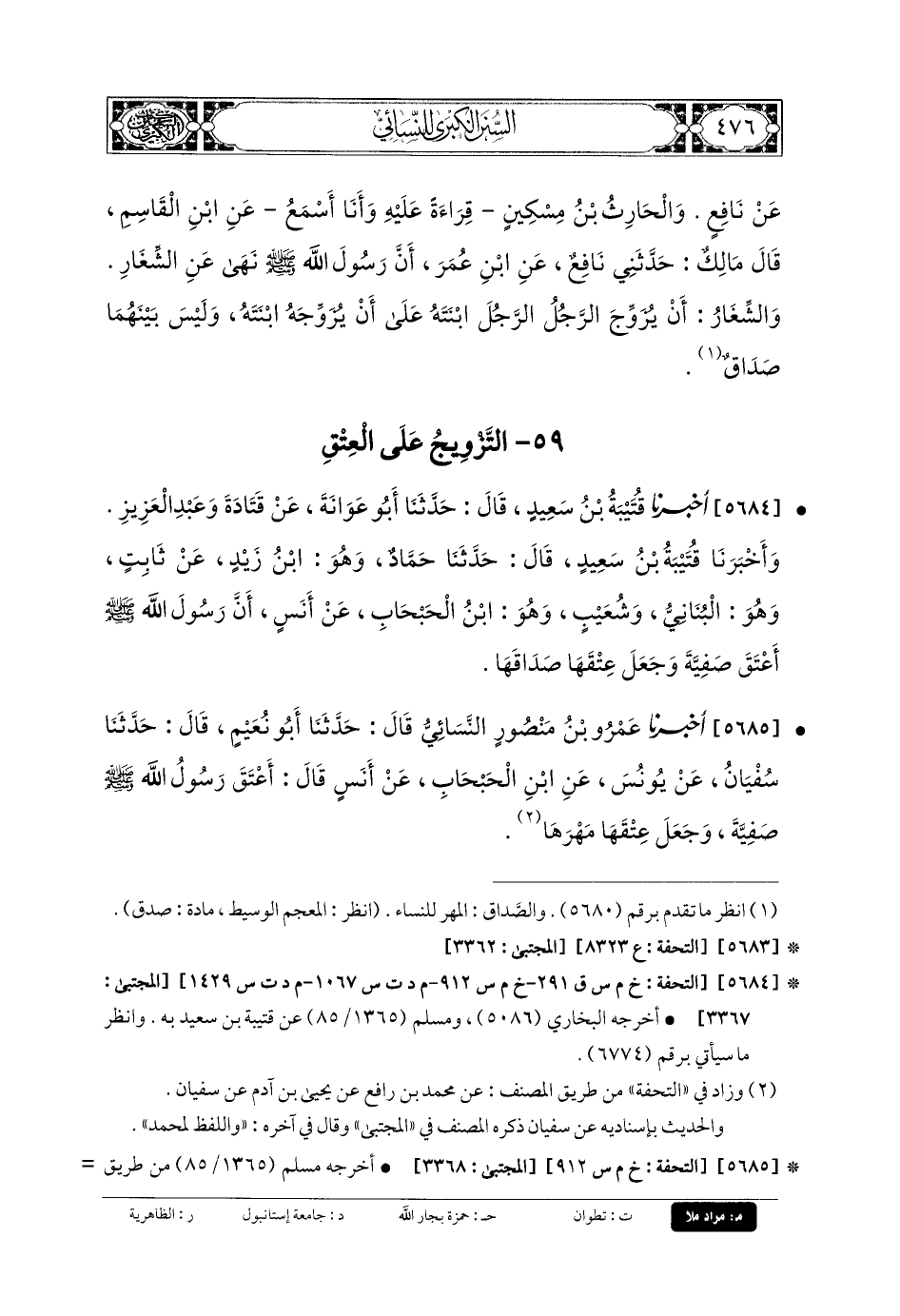 5684- أَخبَرنا قُتَيبَةُ بْنُ سَعِيدٍ، قَالَ: حَدَّثنا أَبو عَوَانَةَ، عَن قَتَادَةَ، وَعَبدُ العَزِيزِ (ح) وَأَخبَرنا قُتَيبَةُ بْنُ سَعِيدٍ، قَالَ: حَدَّثنا حَمَّادٌ، وهو ابنُ زَيْدٍ، عَن ثَابِتٍ، وهُوَ البُنَانِيِّ، وَشُعَيْبٍ، وهو ابْنُ الحَبْحَابِ، عَن أَنَسٍ، أَنَّ رَسُولَ اللهِ صَلى الله عَلَيهِ وسَلم أَعْتَقَ صَفِيَّةَ، وَجَعَلَ عِتْقَهَا صَدَاقَهَا.
