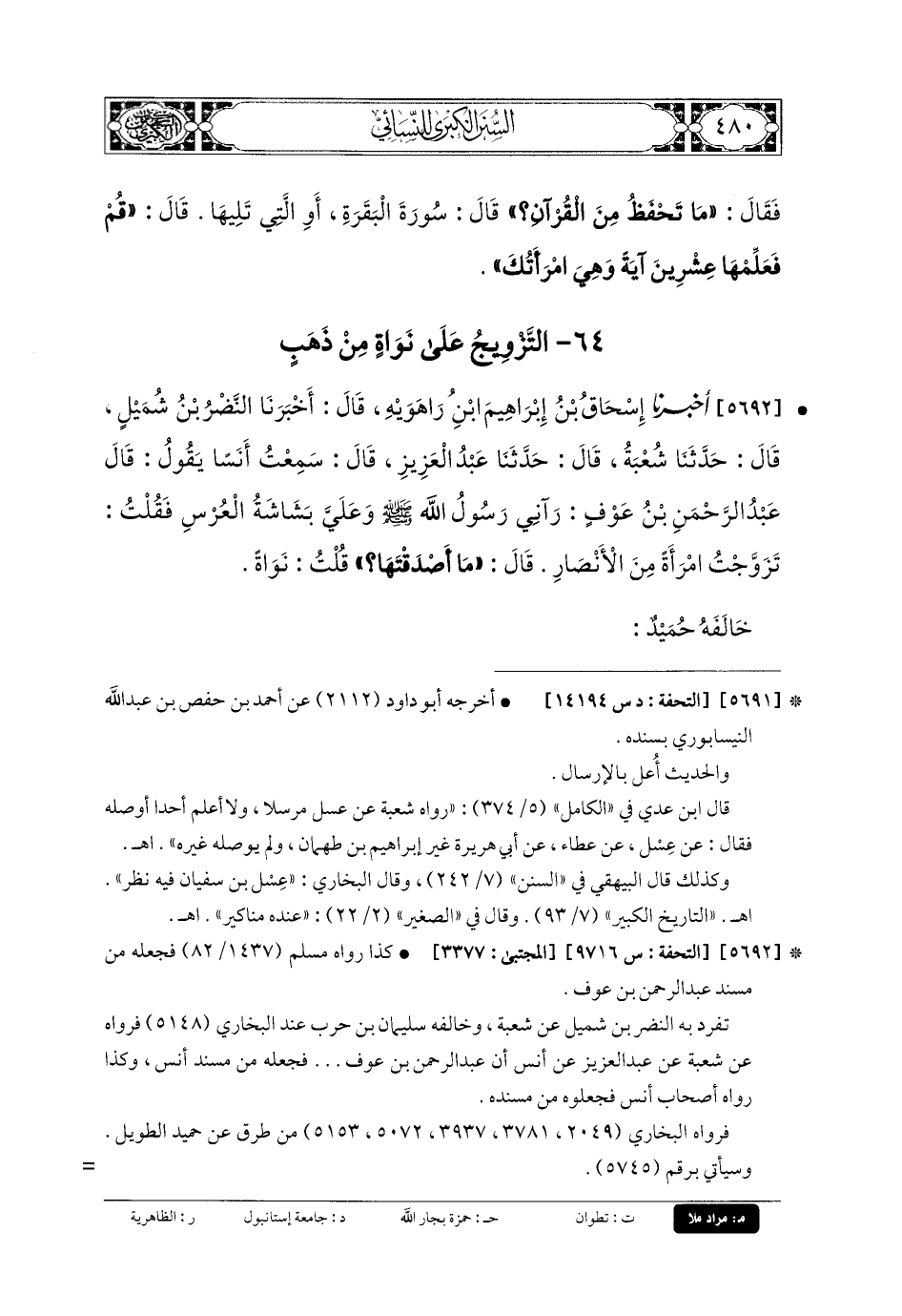 5692- أَخبَرنا إِسحَاقُ بنُ إِبْرَاهِيمَ بْنِ رَاهَوَيْهِ، قَالَ: أَخبَرنا النَّضْرُ بنُ شُمَيْلٍ، قَالَ: حَدَّثنا شُعْبَةُ، قَالَ: حَدَّثنا عَبدُ العَزِيزِ، قَالَ: سَمِعْتُ أَنَسًا يَقُولُ: قَالَ عَبدُ الرَّحمَنِ بنُ عَوْفٍ: رَآنِي رَسُولُ اللهِ صَلى الله عَلَيهِ وسَلم وَعَلَيَّ بَشَاشَةُ العُرْسِ، فَقُلْتُ: تَزَوَّجْتُ امْرَأَةً مِنَ الأَنْصَارِ، قَالَ: مَا أَصْدَقْتَهَا؟ قُلْتُ: نَوَاةً.