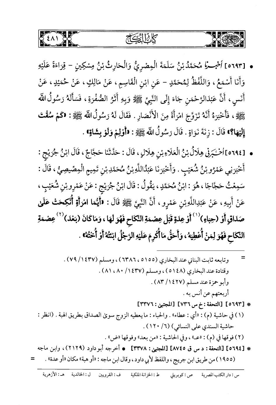 5693- أَخبَرنا مُحَمدُ بنُ سَلَمَةَ المِصْرِيُّ، وَالحَارِثُ بنُ مِسْكِينٍ، قِرَاءَةً عَلَيْهِ، وَأَنَا أَسْمَعُ، وَاللَّفْظُ لِمُحَمدٍ، عَنِ ابْنِ القَاسِمِ، عَن مَالِكٍ، عَن حُمَيْدٍ، عَن أَنَسٍ، أَنَّ عَبدَ الرَّحمَنِ جَاءَ إِلَى النَّبيِّ صَلى الله عَلَيهِ وسَلم وَبِهِ أَثَرُ الصُّفْرَةِ، فَسَأَلَهُ رَسُولُ اللهِ صَلى الله عَلَيهِ وسَلم، فَأَخْبَرَهُ أَنَّهُ تَزَوَّجَ امْرَأَةً مِنَ الأَنْصَارِ، فَقَالَ رَسُولُ اللهِ صَلى الله عَلَيهِ وسَلم: كَمْ سُقْتَ إِلَيْهَا؟ قَالَ: زِنَةَ نَوَاةٍ، قَالَ رَسُولُ اللهِ صَلى الله عَلَيهِ وسَلم: أَوْلِمْ وَلَوْ بِشَاةٍ.