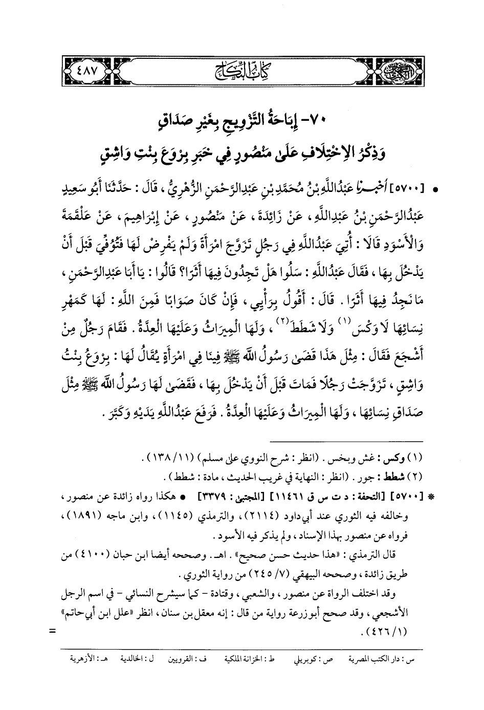 5700- أَخبَرنا عَبدُ اللهِ بنُ مُحَمدِ بنِ عَبدِ الرَّحمَنِ الزُّهْرِيّ، قَالَ: حَدَّثنا أَبو سَعِيدٍ عَبدُ الرَّحمَنِ بنُ عَبدِ اللهِ، عَن زَائِدَةَ، عَن مَنْصُورٍ، عَن إِبْرَاهِيمَ، عَن عَلْقَمَةَ، وَالأَسْوَدِ، قَالا: أُتِيَ عَبدُ اللهِ فِي رَجُلٍ تَزَوَّجَ امْرَأَةً وَلَمْ يَفْرِضْ لَهَا، فَتُوُفِّيَ قَبْلَ أَنْ يَدْخُلَ بِهَا، فَقَالَ عَبدُ اللهِ: سَلُوا هَلْ تَجِدُونَ فِيهَا أَثَرًا؟ قَالُوا: يَا أَبَا عَبدِ الرَّحمَنِ، مَا نَجِدُ فِيهَا أَثَرًا، قَالَ: أَقُولُ بِرَأْيِي، فَإِنْ كَان صَوَابًا فَمِنَ اللهِ لَهَا كَمَهْرِ نِسَائِهَا لا وَكْسَ، وَلا شَطَطَ، وَلَهَا المِيرَاثُ، وَعَلَيْهَا العِدَّةُ، فَقَامَ رَجُلٌ مِنْ أَشْجَعَ، فَقَالَ: مِثْلَ هَذَا قَضَى رَسُولُ اللهِ صَلى الله عَلَيهِ وسَلم فِينَا فِي امْرَأَةٍ، يُقَالُ لَهَا: بِرْوَعُ بِنْتُ وَاشِقٍ تَزَوَّجَتْ رَجُلاً فَمَاتَ قَبْلَ أَنْ يَدْخُلَ بِهَا، فَقَضَى لَهَا رَسُولُ اللهِ صَلى الله عَلَيهِ وسَلم مِثْلَ صَدَاقِ نِسَائِهَا، وَلَهَا المِيرَاثُ، وَعَلَيْهَا العِدَّةُ، فَرَفَعَ عَبدُ اللهِ يَدَيْهِ وَكَبَّرَ.
