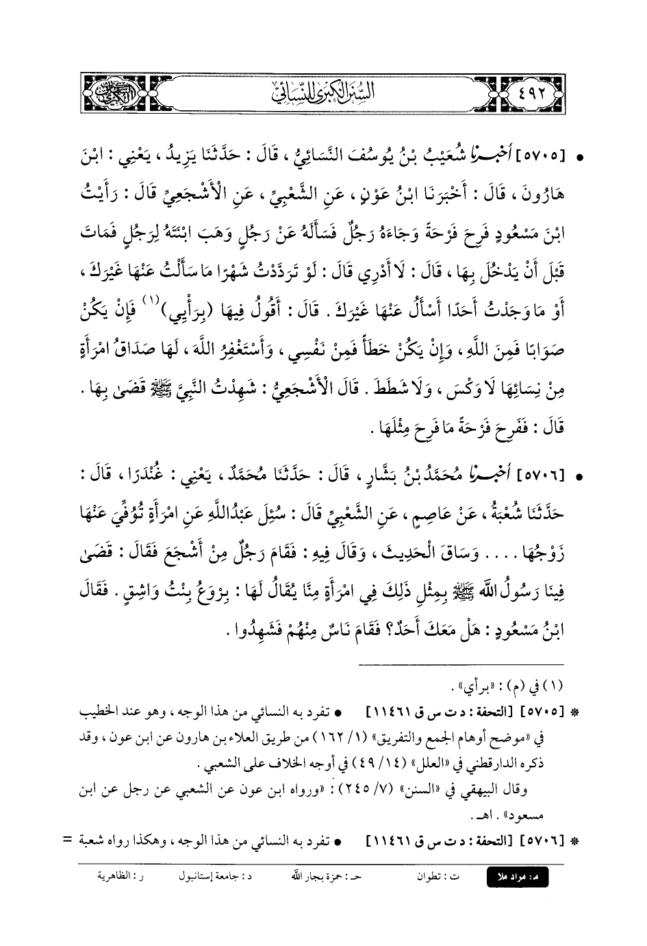 5706- أَخبَرنا مُحَمدُ بنُ بَشَّارٍ، قَالَ: حَدَّثنا مُحَمدٌ، يَعْنِي غُنْدَرًا، قَالَ: حَدَّثنا شُعْبَةُ، عَن عَاصِمٍ، عَنِ الشَّعْبِيِّ، قَالَ: سُئِلَ عَبدُ اللهِ عَنِ امْرَأَةٍ تُوُفِّيَ عَنهَا زَوْجُهَا، ... وَسَاقَ الحَدِيثَ، وَقَالَ فِيهِ: فَقَامَ رَجُلٌ مِنْ أَشْجَعَ، فَقَالَ: قَضَى فِينَا رَسُولُ اللهِ صَلى الله عَلَيهِ وسَلم بِمِثْلِ ذَلِكَ فِي امْرَأَةٍ مِنَّا يُقَالُ لَهَا: بِرْوَعُ بِنْتُ وَاشِقٍ، فَقَالَ ابْنُ مَسْعُودٍ: هَلْ مَعَكَ أَحَدٌ؟ فَقَامَ نَاسٌ مِنْهُمْ فَشَهِدُوا.