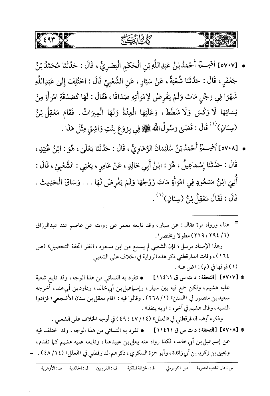5708- أَخبَرنا أَحْمَدُ بنُ سُلَيْمَانَ الرُّهَاوِيُّ، قَالَ: حَدَّثنا يَعْلَى، هُوَ ابْنُ عُبَيْدٍ، قَالَ: حَدَّثنا إِسمَاعِيلُ، هُوَ ابْنُ أَبي خَالِدٍ، عَن عَامِرٍ، يَعْنِي الشَّعْبِيَّ، قَالَ: أُتِيَ ابْنُ مَسْعُودٍ فِي امْرَأَةٍ مَاتَ زَوْجُهَا، وَلَمْ يَفْرِضْ لَهَا ... وَسَاقَ الحَدِيثَ، قَالَ: فَقَالَ مَعْقِلُ بنُ سِنَانٍ: (قَضَى رَسُولُ اللهِ صَلى الله عَلَيهِ وسَلم فِي بَرْوَعَ بِنْتِ وَاشِقٍ مِثْلَ هَذَا) (1).